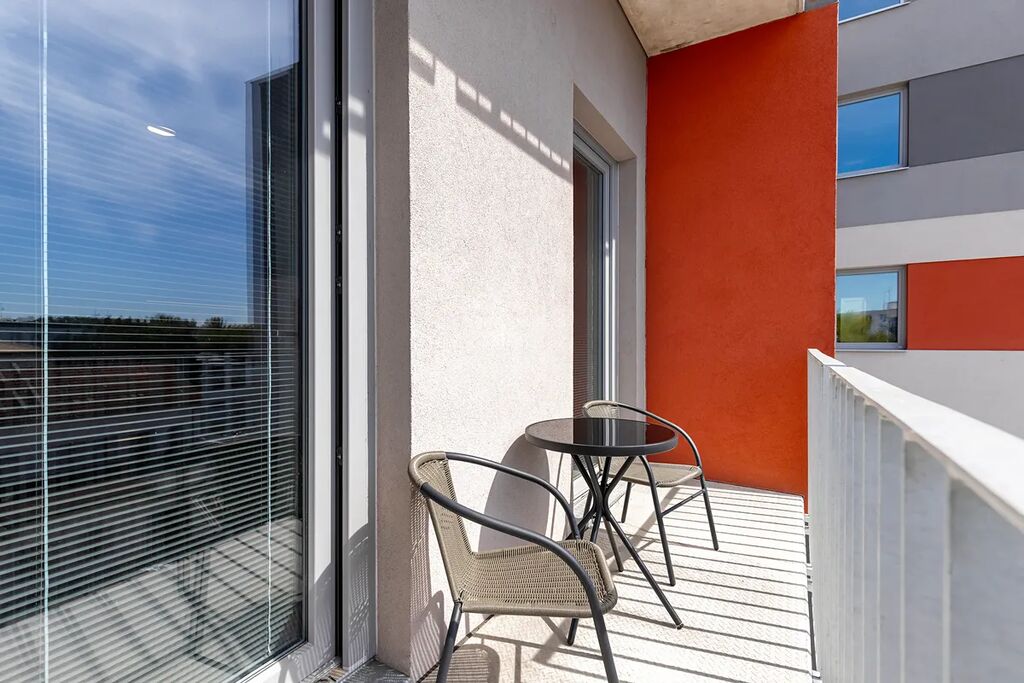Nabízíme k pronájmu moderně zařízený byt 1+kk, o celkové výměře 35 m², v 6. nadzemním podlaží novostavby s výtahem v Hradci Králové. Interiér bytu je zařízený kuchyňskou linkou s vestavěnými spotřebiči (lednice s mrazákem, varná deska, mikrovlnná trouba). Kuchyň je plně vybavena nádobím k drobnému vaření, jídelní soupravou atd. V místnosti se dále nachází obývací sestava, jídelní stůl se židlemi. Součástí bytu je manželská postel s nočními stolky a lampičkami, spousta úložných prostorů a velká TV. Z chodbičky je vstup do vlastní koupelny se sprchovým koutem, žebříkovým radiátorem, WC, velkým zrcadlem a vestavěným fénem. V pokoji jsou dvě velká balkónová okna se vstupem na soukromý balkón, který je vybaven 2x křeslo a stolek s výhledem do klidné části vnitrobloku.