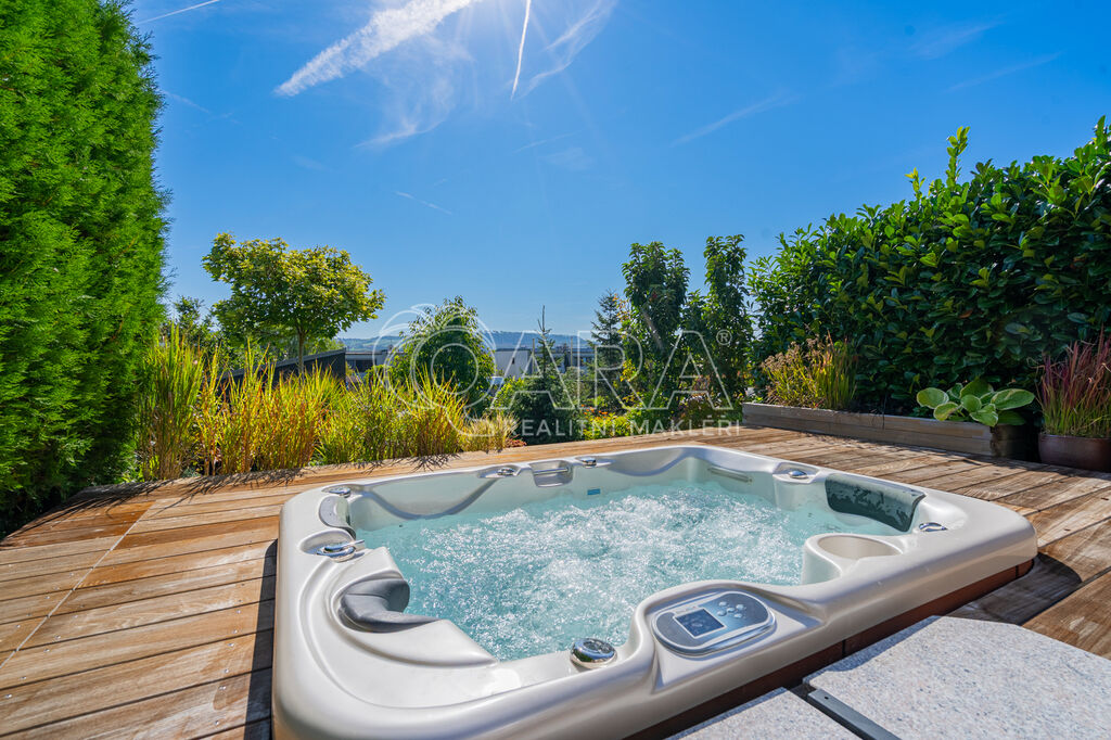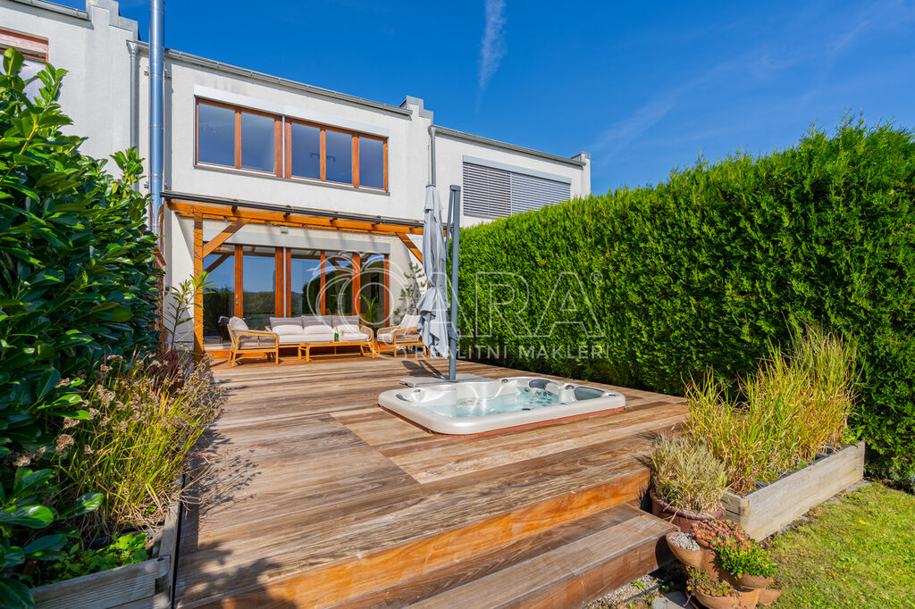 • Zahrada 162 m² se vzrostlou zelení, terasou s pergolou a vířivkou a zahradním domkem