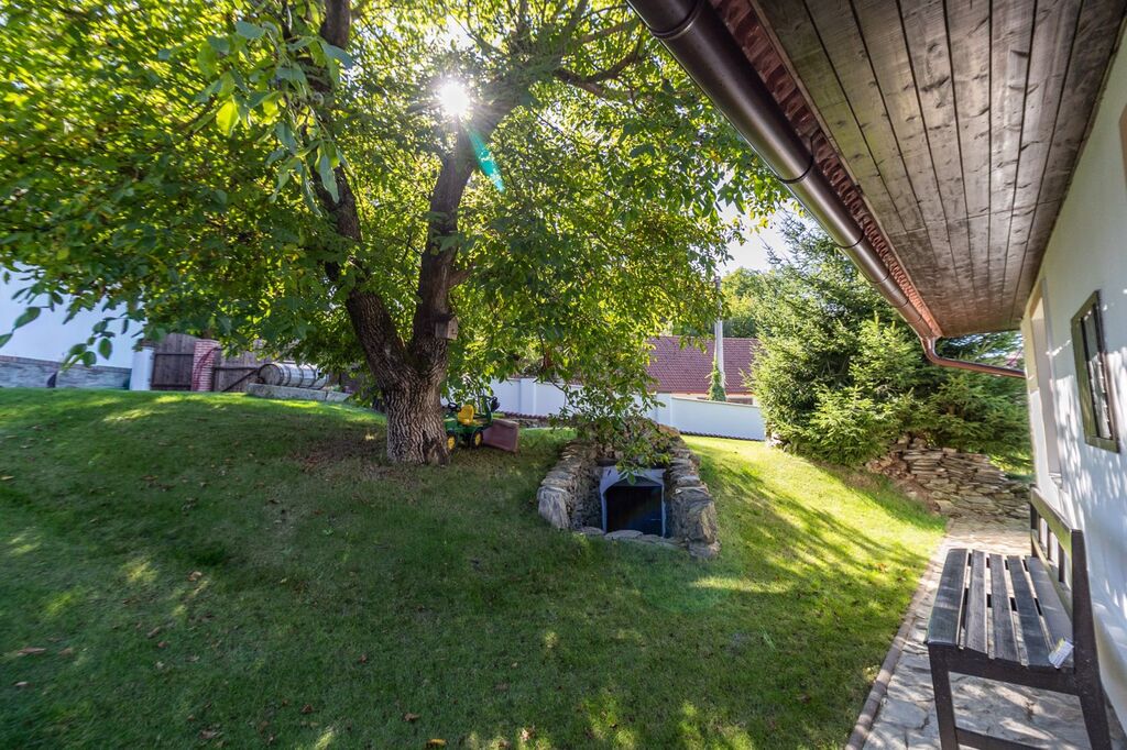 Dispoziční řešení: 4+1 o zast. ploše domu cca 180 m2, s celkovou obytnou pl. cca 100m2, o celkové ploše pozemku 1.155m2. Vnitřní dispozice: vstupní předsíň s chodbou a funkční udírnou, kuchyně s funkční pecí, el. sporákem s vestavěnými spotřebiči v nové kuchyňské lince, prostorný obývací pokoj + další tři pokoje; koupelna se sprchovým koutem, topným žebříkem, WC. Na dům navazují dva prostory s klenbovými stropy a komínem, vhodné k vytvoření příjemného společenského posezení, či vinárny. Prostory lze sloučit. Dřevěné masivní posezení je k dispozici. Součástí nemovitosti je velmi prostorná stodola (140 m2) s vlastním sklepem. Do stodoly je přívedena voda a odpady, na podlaze je leštěný beton. Dále pak nádherný zemní sklípek (10m2). Pozemek je obestavěn zdí v kombinaci osázenými stromky, které zajišťují naprosté soukromí nemovitosti se sluncem po celý den.