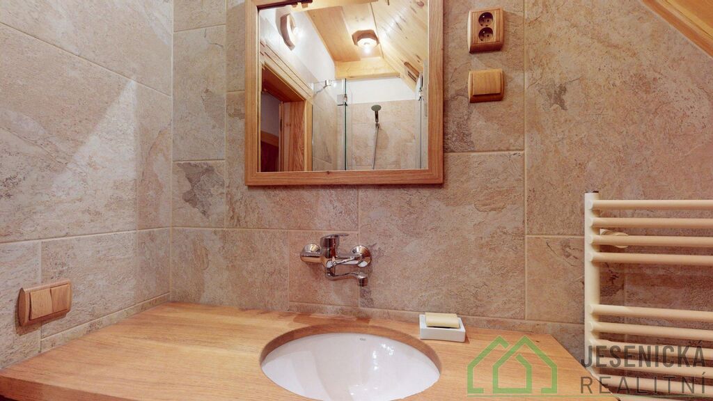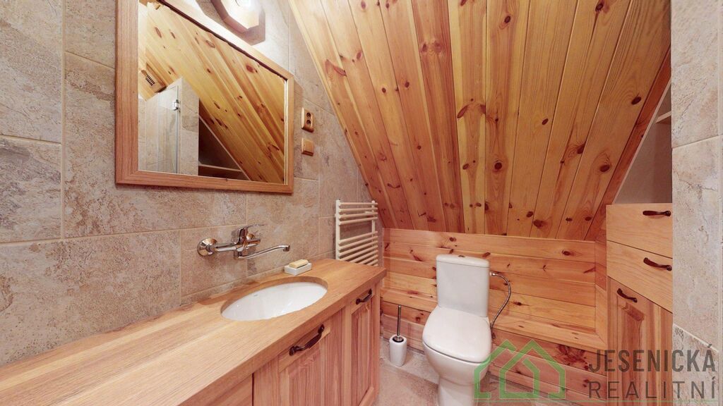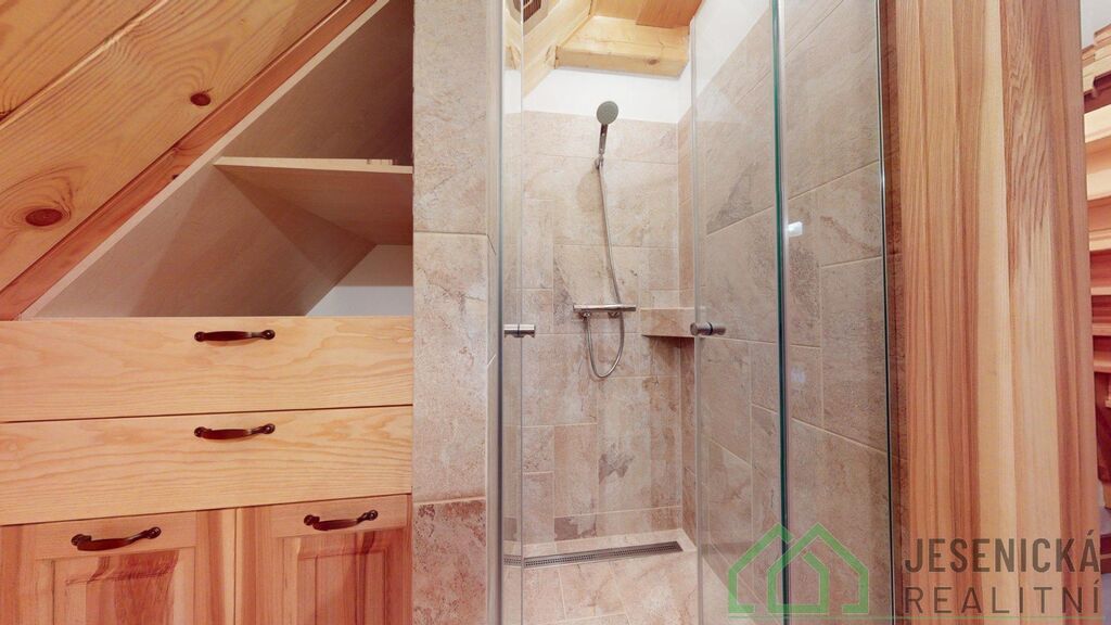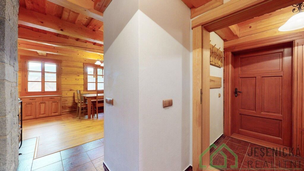 V jednom pokoji vstup do půdního prostoru, který je rovněž obložen jasanem a může sloužit jako další místo k přenocování.