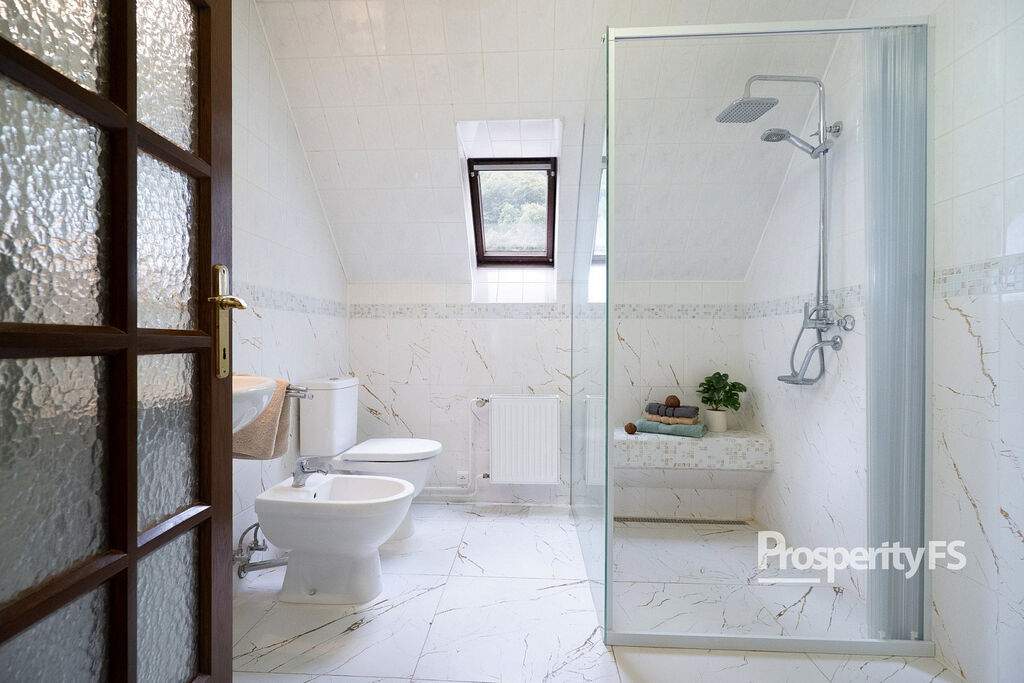 Interiér nabízí kvalitní provedení a řadu zajímavých prvků – majiteli ručně vyrobené kazetové stropy, dřevěné schodiště a mramorový krb. Pro přípravu pokrmů je kuchyň vybavena elektrickou troubou v kombinaci s varnou deskou. V domě jsou tři toalety, dvě koupelny, z toho jedna s vanou a další koupelna se sprchovým koutem, což umožňuje dostatek pohodlí i pro početnější rodinu.