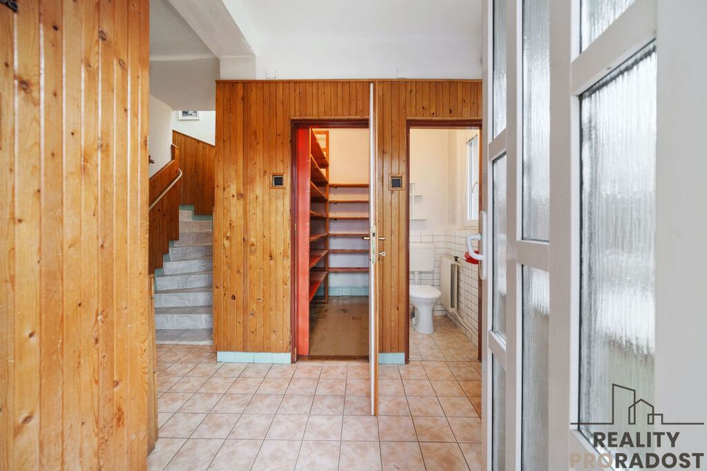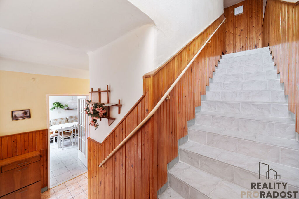 V přízemí se nachází prostorná kuchyně s jídelnou, která navazuje na obývací pokoj a následuje ložnice. Ze vstupní chodby je dále vstup na samostatné WC, spíž, koupelnu, komoru, vstup do sklepa a schodiště propojuje patro.