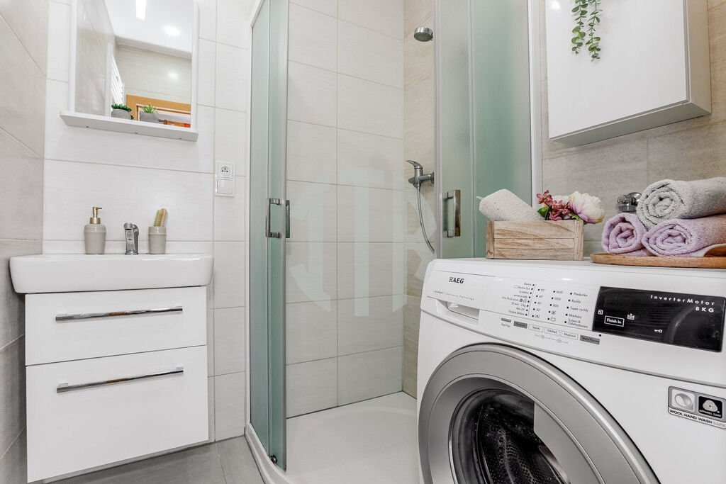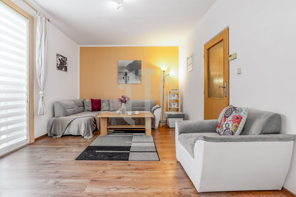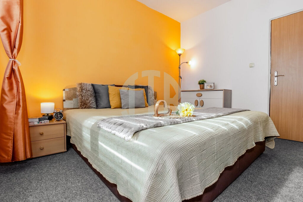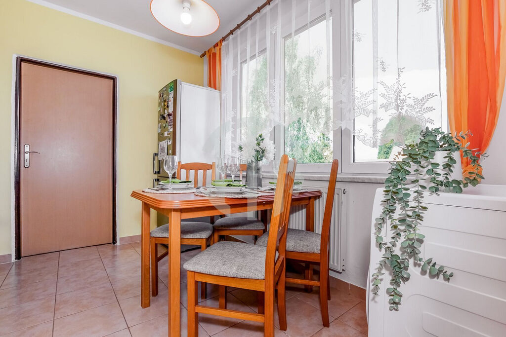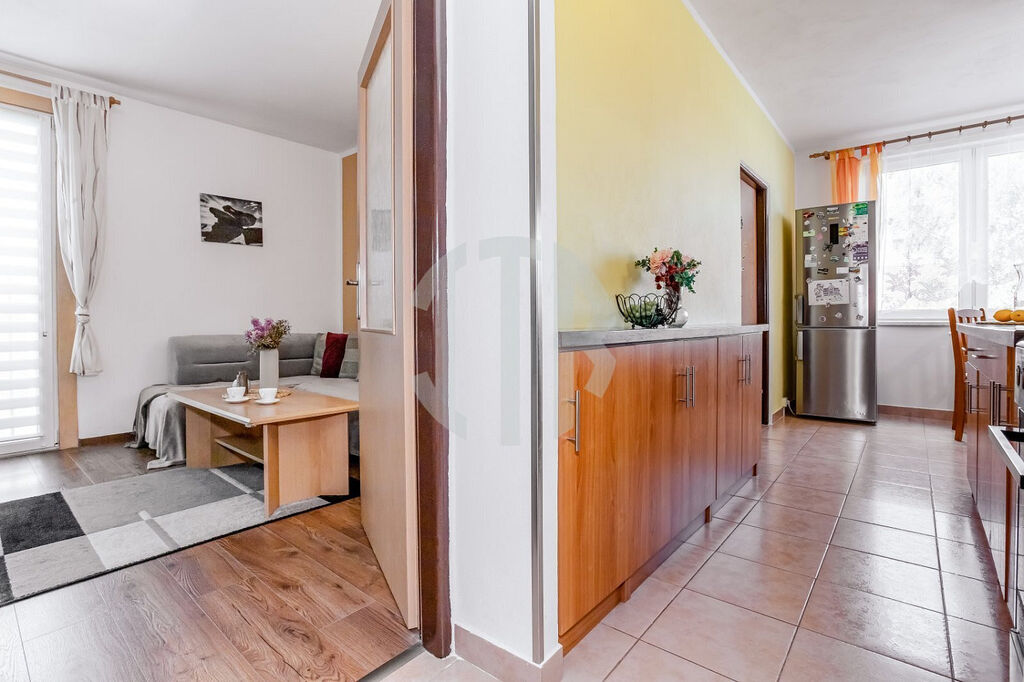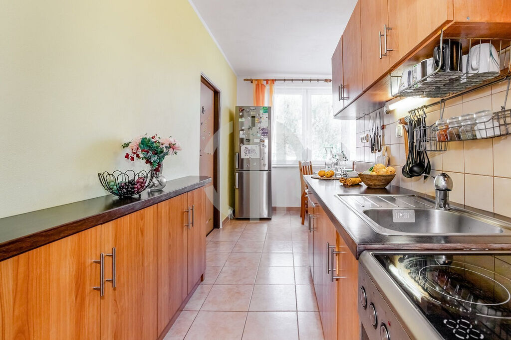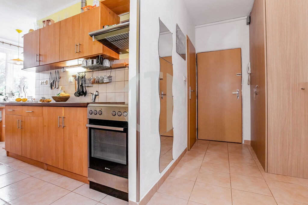 Dispozice bytové jednotky: hlavní vstup do bytu se zádveřím a vestavěnými skříněmi, samostatná kuchyně s jídelnou opatřená kuchyňskou linkou, koupelna se sprchovým koutem, umyvadlem a pračkou, samostatné WC, dětský pokoj, hlavní obývací pokoj s francouzským oknem a ložnice. K bytu náleží sklepní kóje v suterénu bytového domu, možnost parkování osobního automobilu přímo před domem.