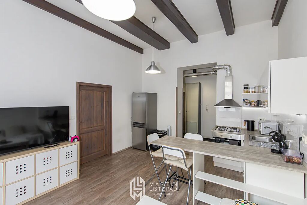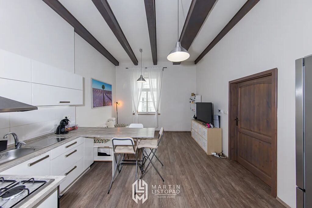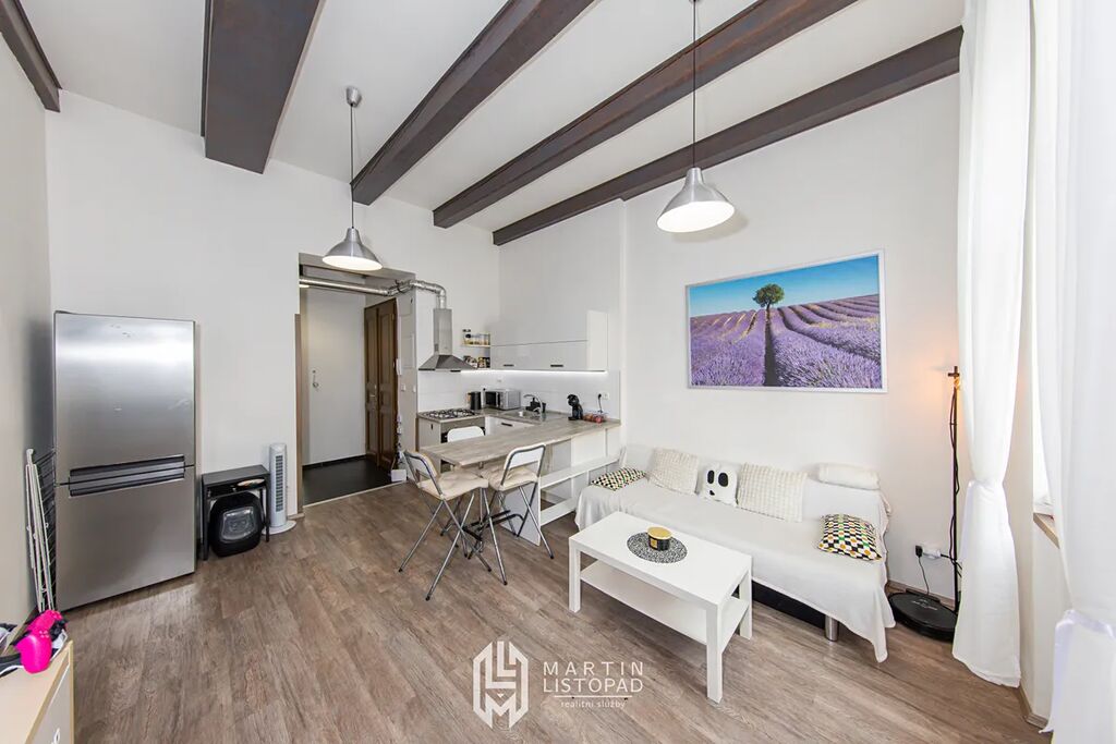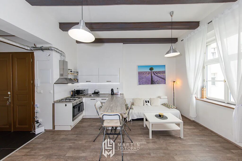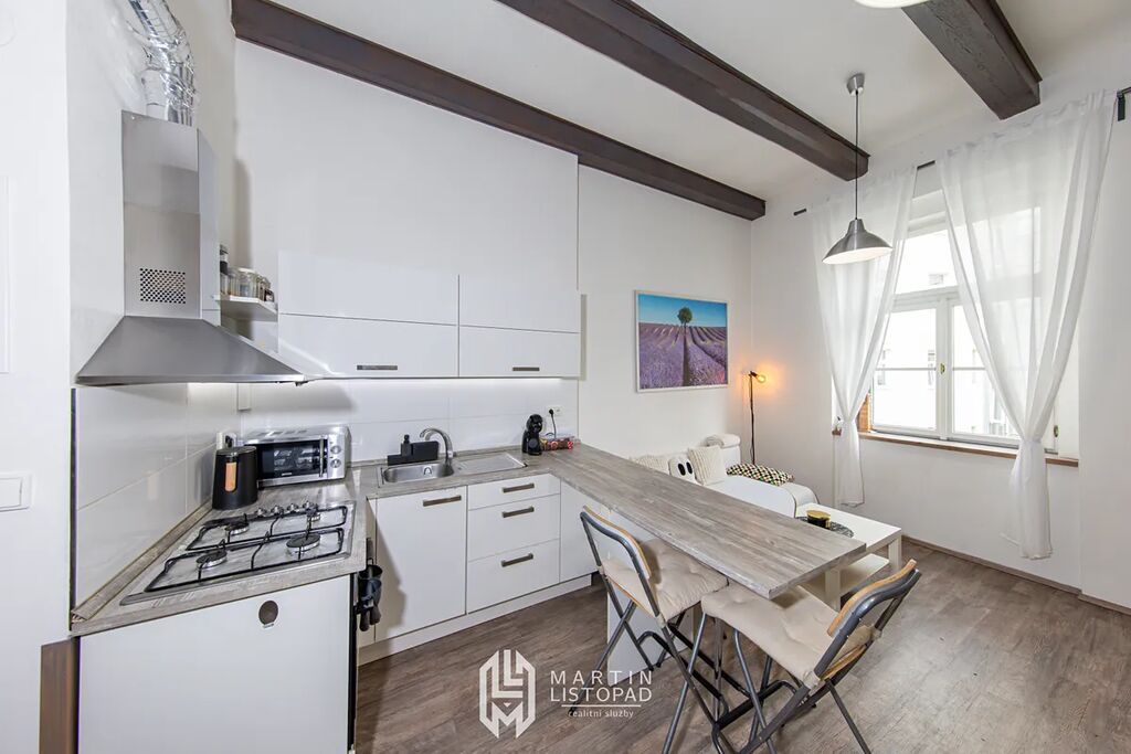 Bytová jednotka s užitnou plochou 43 m2 se nachází ve 3. NP rezidenčního domu Champagne House s výtahem. Jednotka je po celkové nákladné rekonstrukci (nové vinylové podlahy, kompletně nové rozvody, dřevěná okna, koupelna, dveře a další) a dispozičně je řešena jako 2+kk, kdy dominantním pokojem je prostorný obývací pokoj s kuchyňským a jídelním koutem. Z obývacího pokoje se vchází do útulné ložnice, která má stejně jako obývací pokoj okna orientována do vnitrobloku, což zaručuje nerušený spánek a odpočinek. Dále byt disponuje zádveřím, koupelnou se sprchovým koutem, umyvadlem a wc. Zdrojem vytápění a ohřevu vody je kondenzační plynový kotel v kombinaci s podlahovým teplovodním topením. Odkryté původní trámy ve stropě a podhledy mezi trámy s výškou stropu přes 3 metry dodávají nemovitosti pocit vzdušnosti a zajímavé kouzlo. K bytu náleží sklep o výměře 3,4m2.