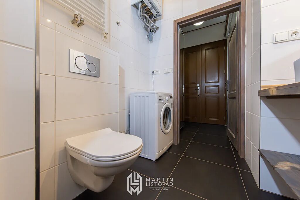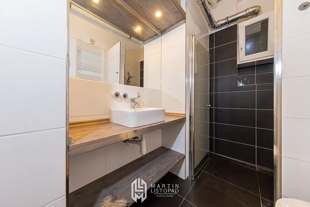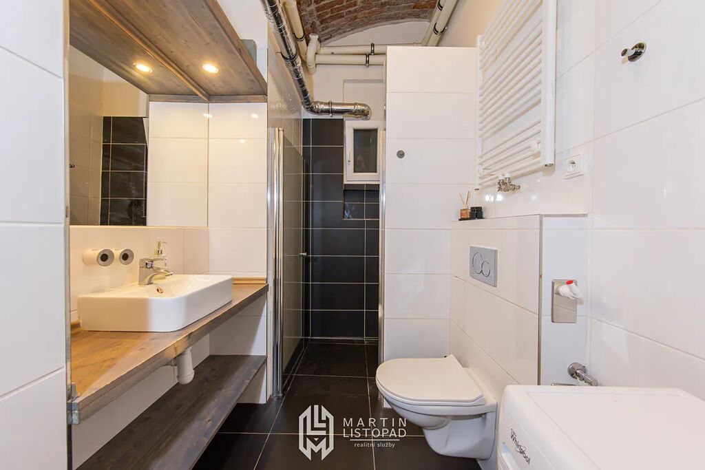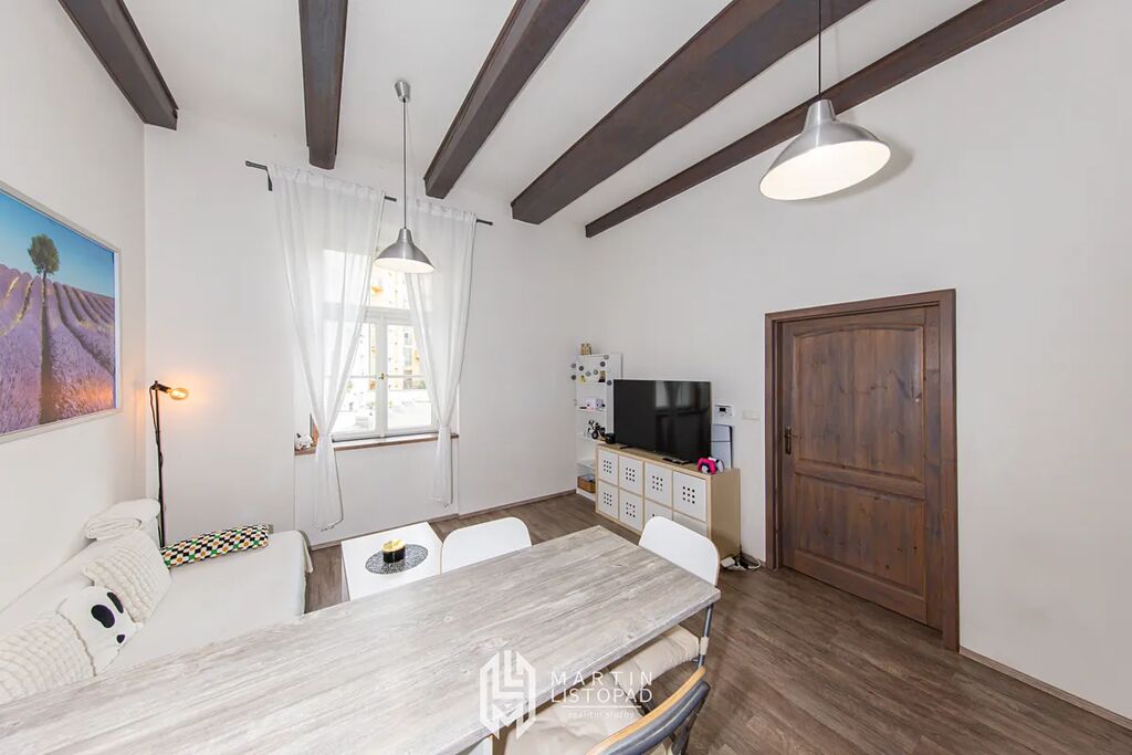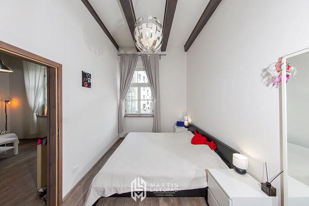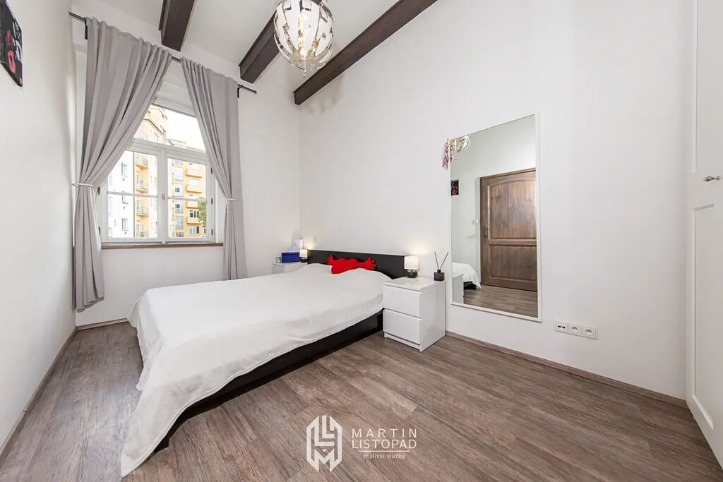 Bytová jednotka s užitnou plochou 43 m2 se nachází ve 3. NP rezidenčního domu Champagne House s výtahem. Jednotka je po celkové nákladné rekonstrukci (nové vinylové podlahy, kompletně nové rozvody, dřevěná okna, koupelna, dveře a další) a dispozičně je řešena jako 2+kk, kdy dominantním pokojem je prostorný obývací pokoj s kuchyňským a jídelním koutem. Z obývacího pokoje se vchází do útulné ložnice, která má stejně jako obývací pokoj okna orientována do vnitrobloku, což zaručuje nerušený spánek a odpočinek. Dále byt disponuje zádveřím, koupelnou se sprchovým koutem, umyvadlem a wc. Zdrojem vytápění a ohřevu vody je kondenzační plynový kotel v kombinaci s podlahovým teplovodním topením. Odkryté původní trámy ve stropě a podhledy mezi trámy s výškou stropu přes 3 metry dodávají nemovitosti pocit vzdušnosti a zajímavé kouzlo. K bytu náleží sklep o výměře 3,4m2.