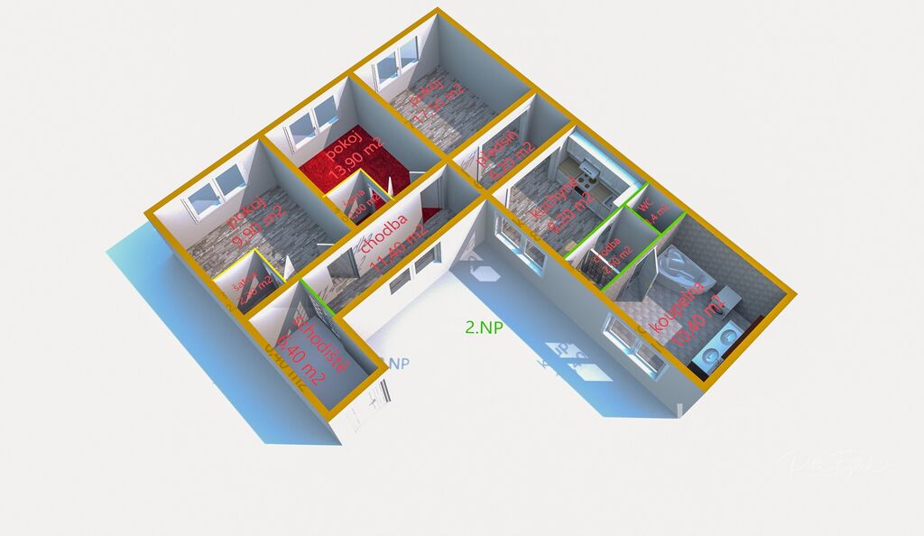 - V patře je bytová jednotka 3+1 s užitnou plochou 92,10 m².