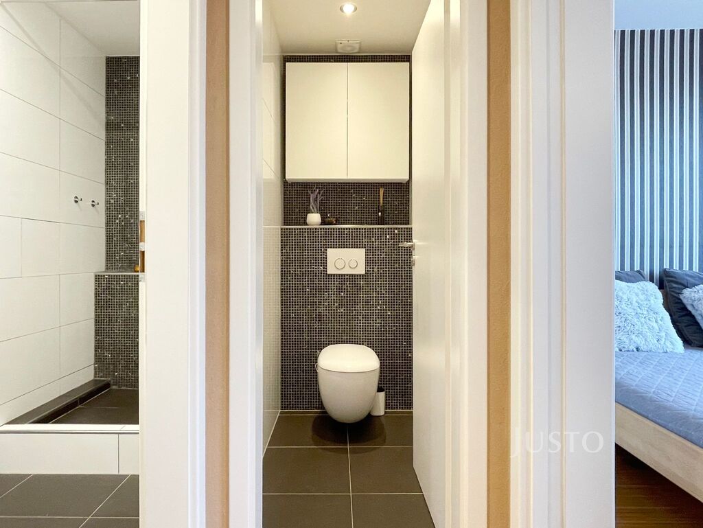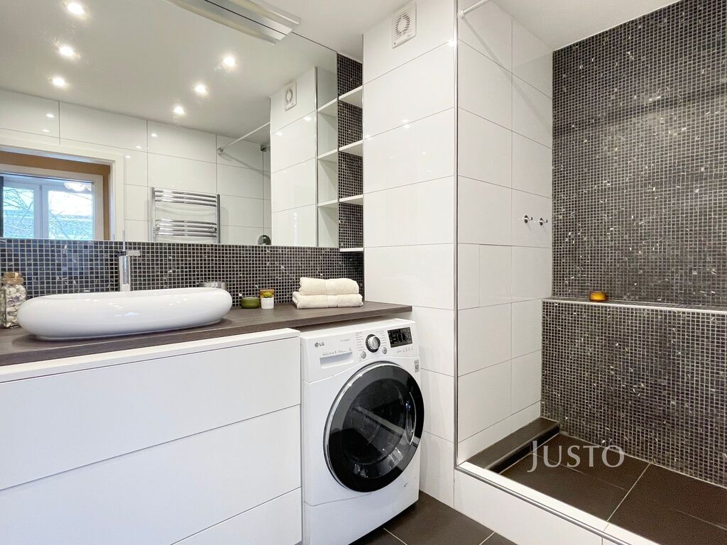 Koupelna je opatřena luxfery pro větší světlost místnosti, sprchovým koutem, umyvadlem a disponuje i místem pro pračku. Sanita v koupelně a na toaletě vyniká kvalitou a jednoduchým designem.