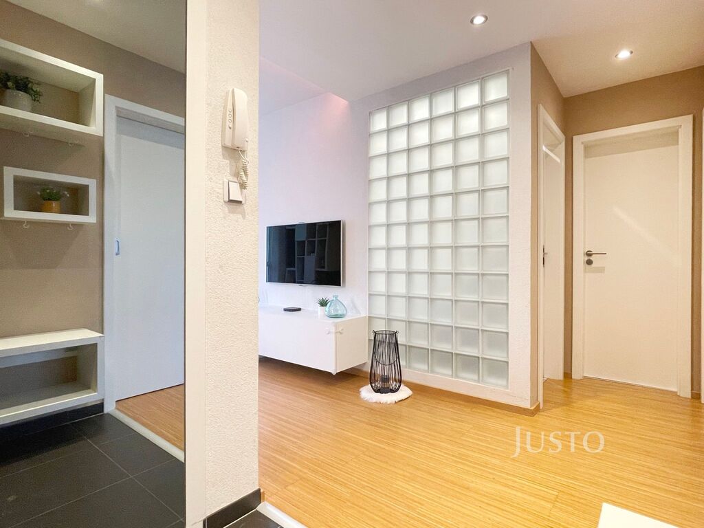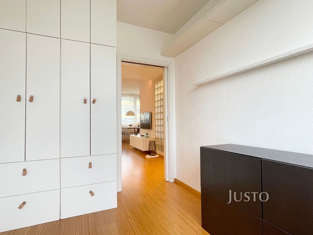 Chodba bytu je dalším úložným prostorem, vestavěná skříň v zádveří vykrývá celou niku a dotváří povedený interiér.