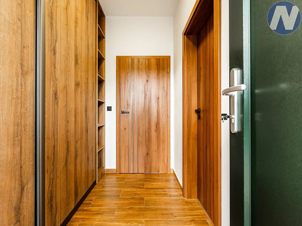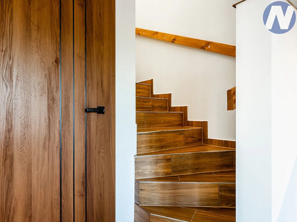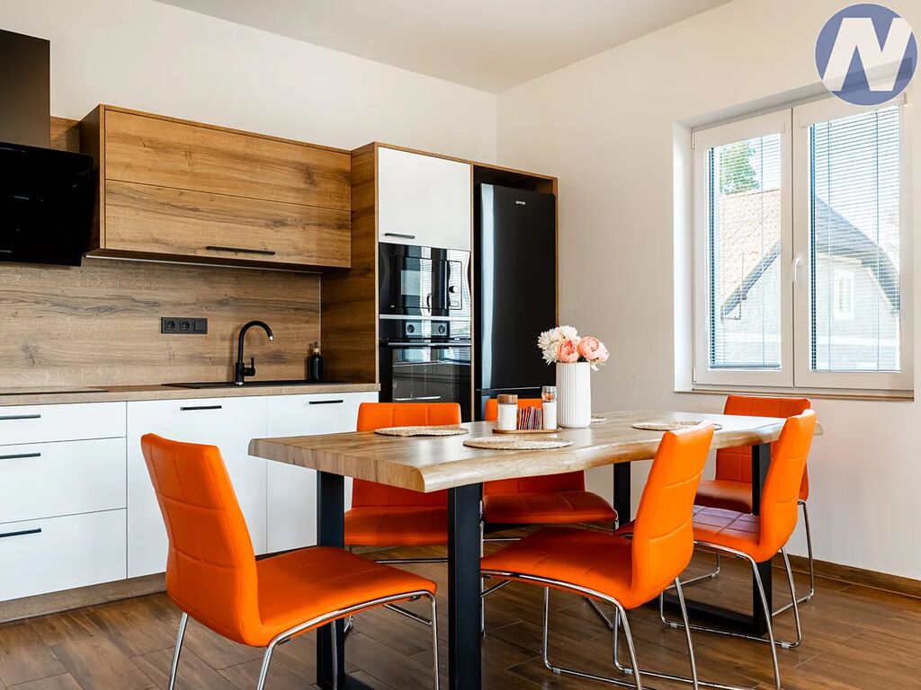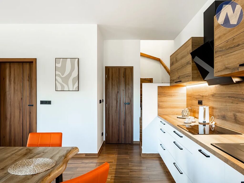 V přízemí najdete moderní kuchyni se spotřebiči, obývací prostor a koupelnu se sprchovým koutem.