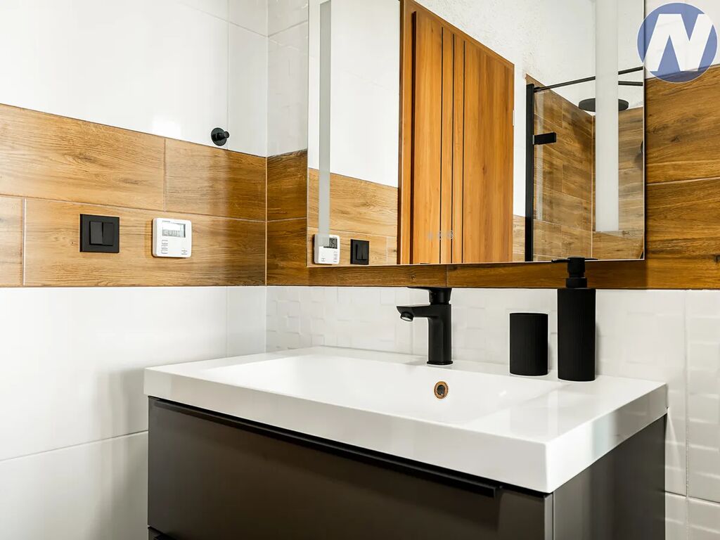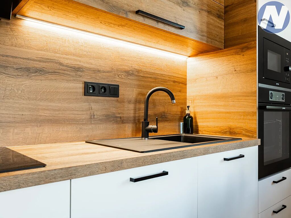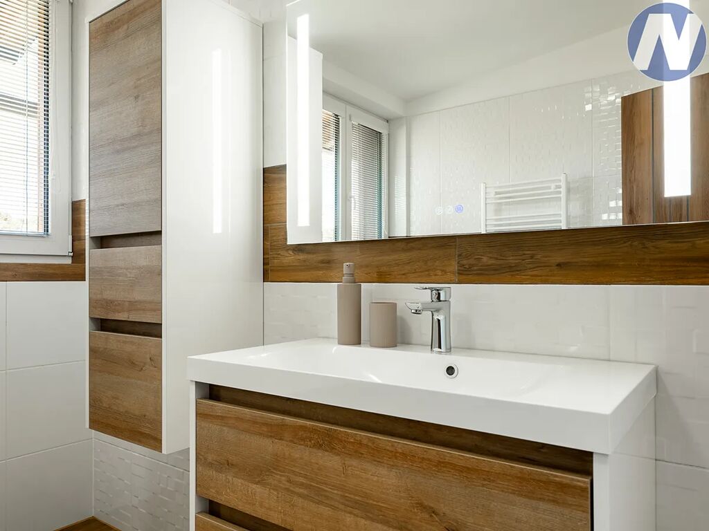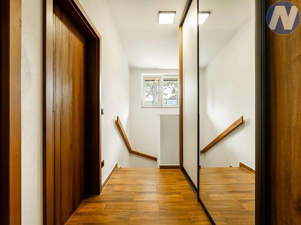 V přízemí najdete moderní kuchyni se spotřebiči, obývací prostor a koupelnu se sprchovým koutem.