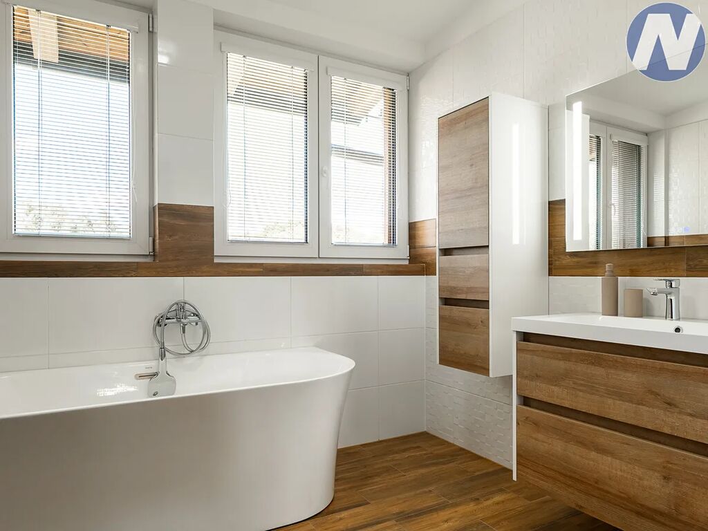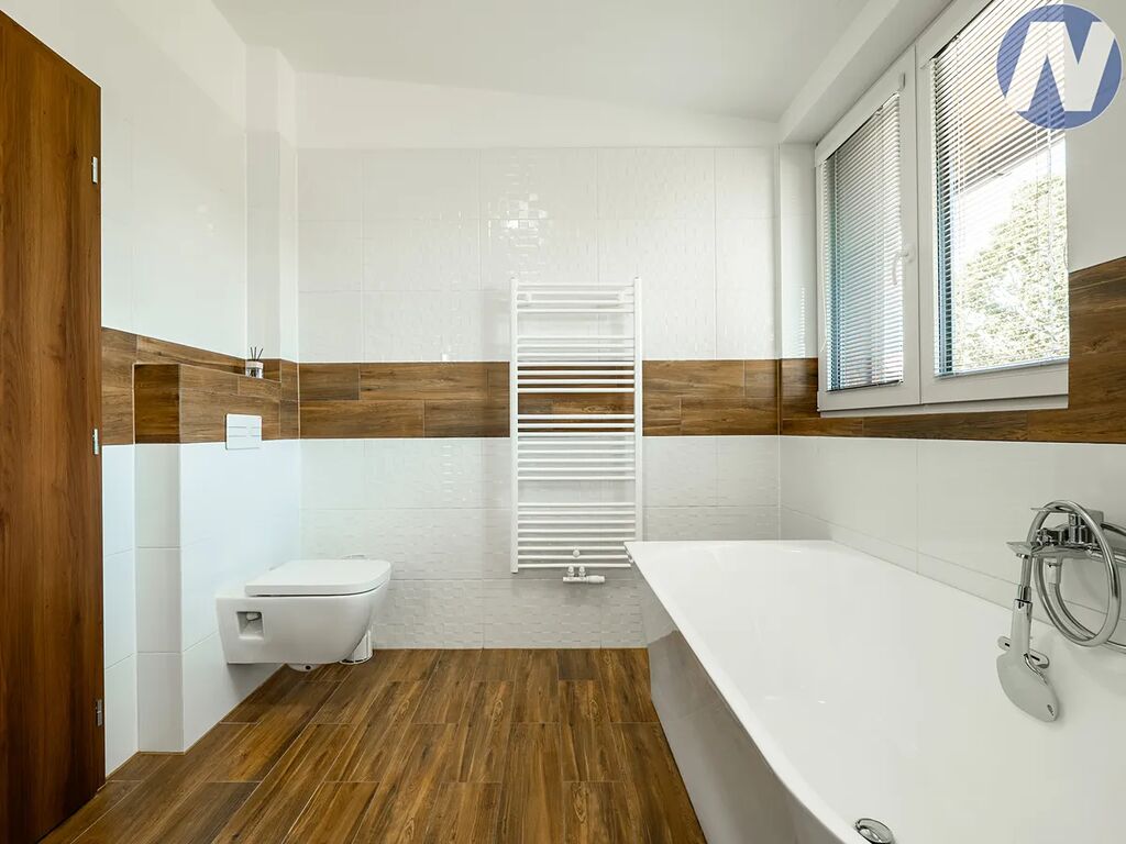 V patře dva útulné pokoje a druhou koupelnu s vanou.
