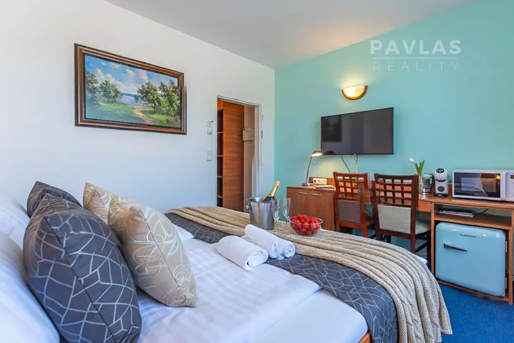 Apartmán s bezbariérovým přístupem (výtah až ke dveřím) disponuje prostorným zádveřím s úložnou kapacitou, koupelnou s WC, světlou obytnou částí s výhledem do hotelového areálu. Jednotka prošla modernizací – nábytek, obklady i sanita jsou nové. Součástí ceny je kompletní vybavení včetně TV, lednice, vestavěných skříní, obývací stěny s jídelním a psacím stolem, mikrovlnné trouby, kávovaru a dalších elektrických spotřebičů. Apartmán je ihned připraven k užívání nebo výnosnému pronájmu.