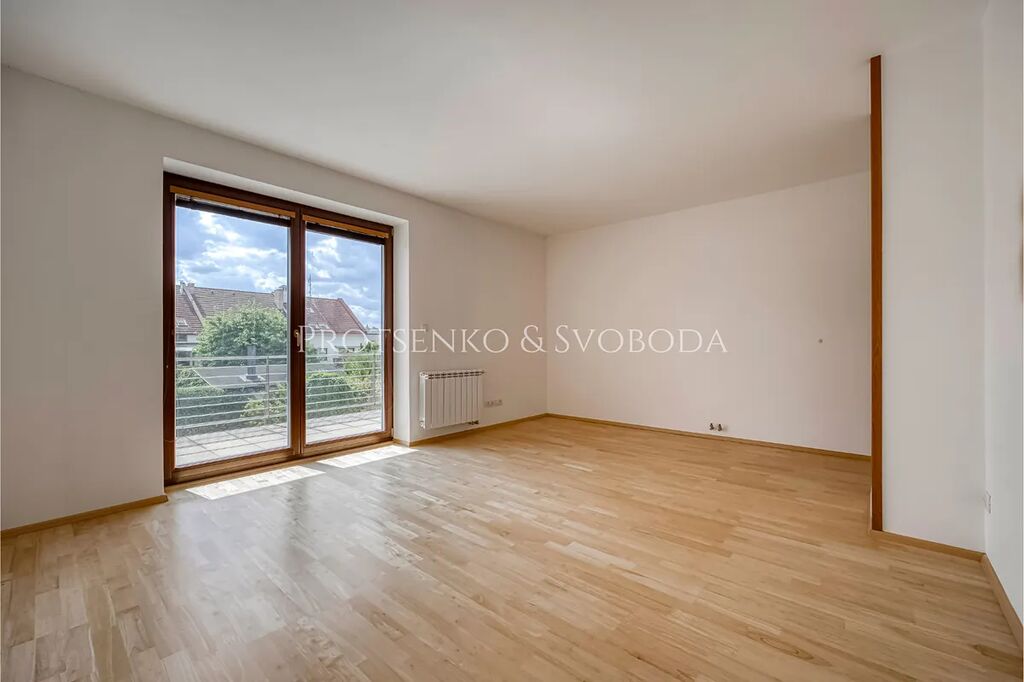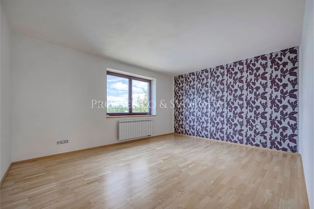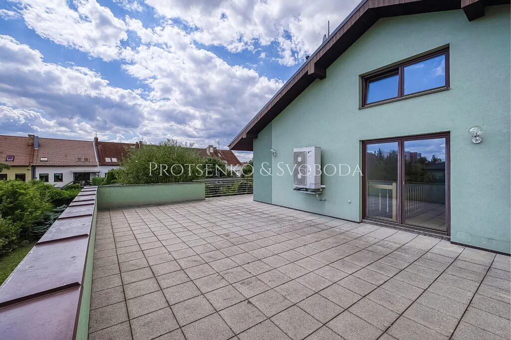 Tři prostorné pokoje (ve dvou jsou vestavěné skříně), samostatná šatna/pracovna a velká koupelna s rohovou vanou, sprchovým koutem, dvěma umyvadly, WC a bidetem. Podlahy jsou plovoucí dřevěné, vytápění je zajištěno hliníkovými radiátory. Z chodby je vstup na střešní terasu (65 m²), která navazuje na balkon (21 m²) orientovaný na jih.