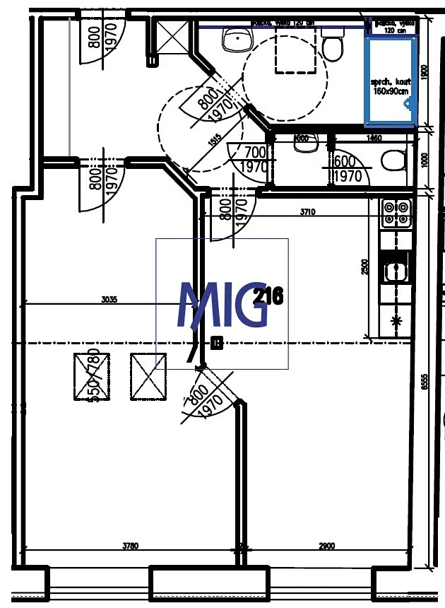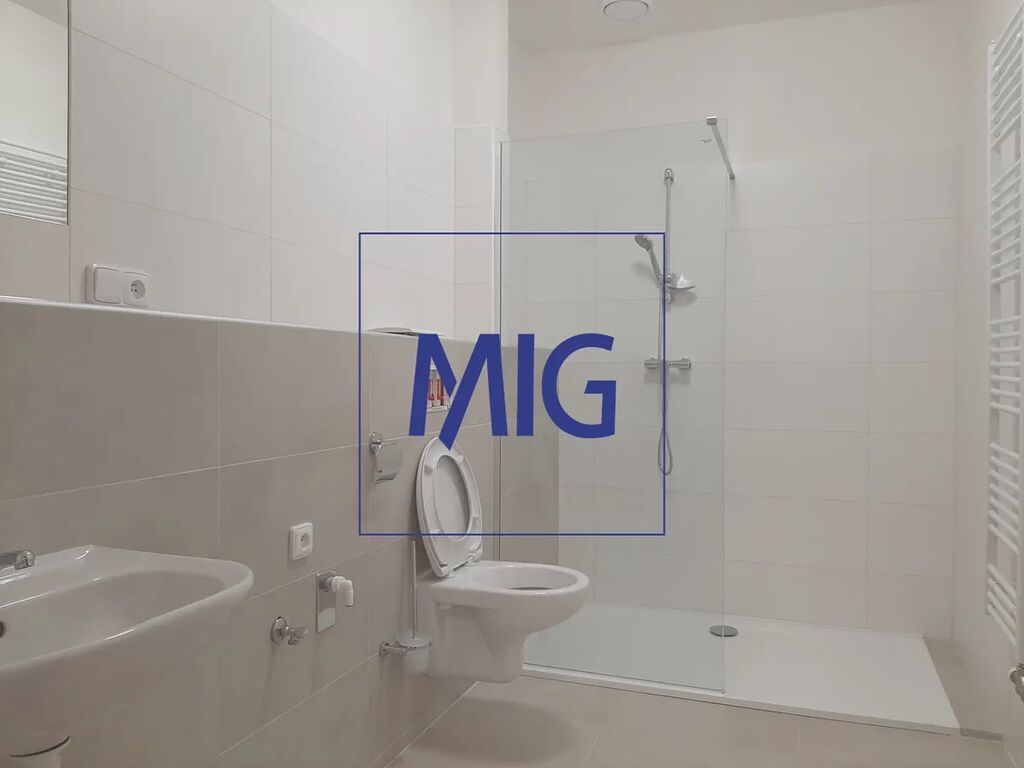 Obývací pokoj je vybaven kuchyňským koutem, dále je tu dost prostoru pro jídelní stůl se židlemi, sedací soupravu a skříňky. Velmi prostorný obytný pokoj skýtá dostatek prostoru pro dvoulůžko, skříně a případně další dětské lůžko. Pokoj je průchozí a lze jej rozdělit na dvě samostatné místnosti. Do zádveří se pohodlně vejde šatní skříň i botník a je zde místo pro připojení pračky, prostorná koupelna je vybavena umyvadlem, toaletou, sprchovým koutem, v bytě je ještě k dispozici druhé WC.