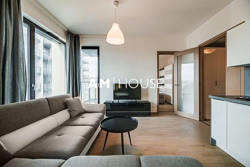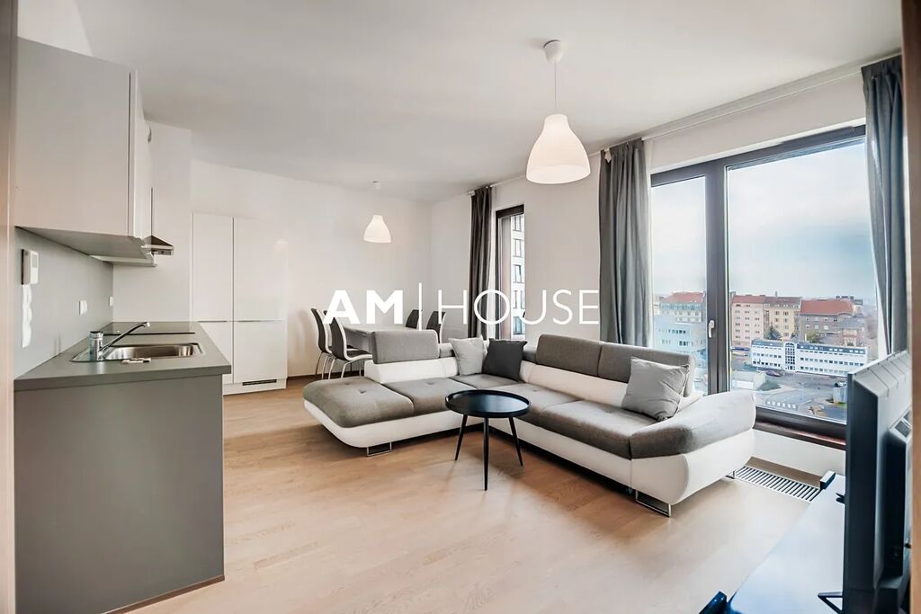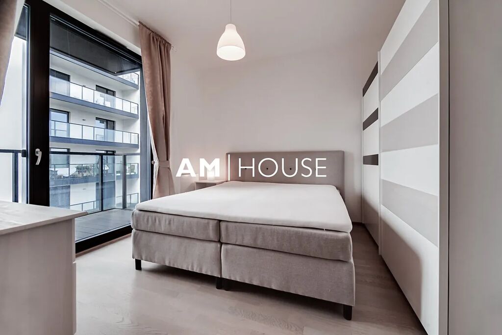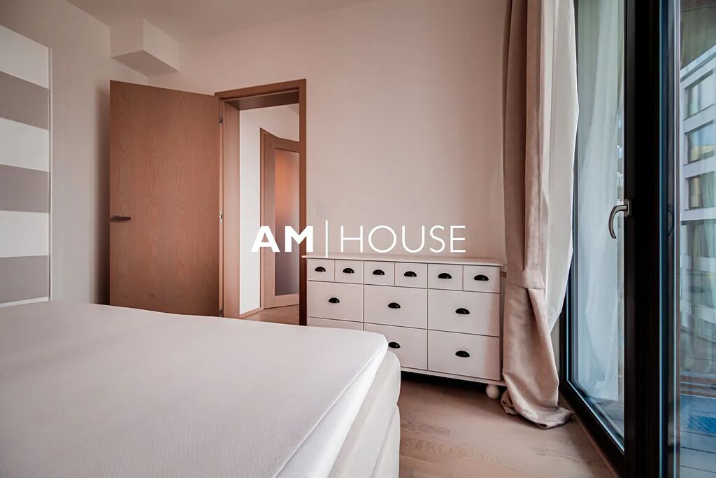 Kompletně zařízený a stylový byt se nachází v 7. nadzemním podlaží v novostavbě. Interiér bytu tvoří obývací pokoj se vstupem na balkon, ložnici a koupelnu. Ložnice má postel a velkou skříň.