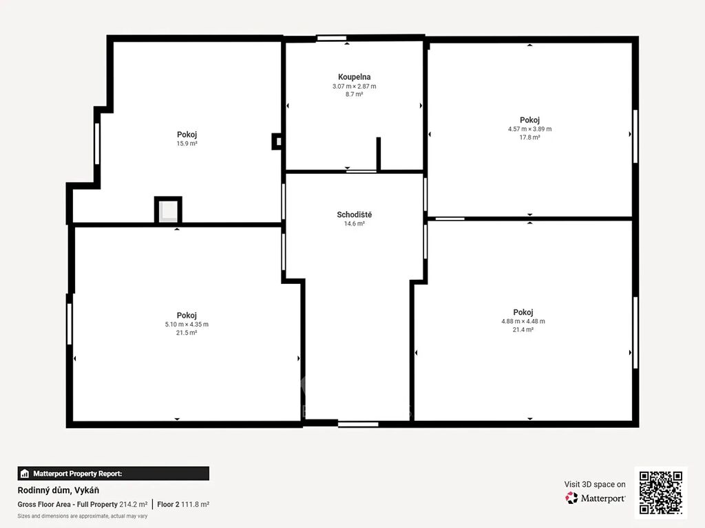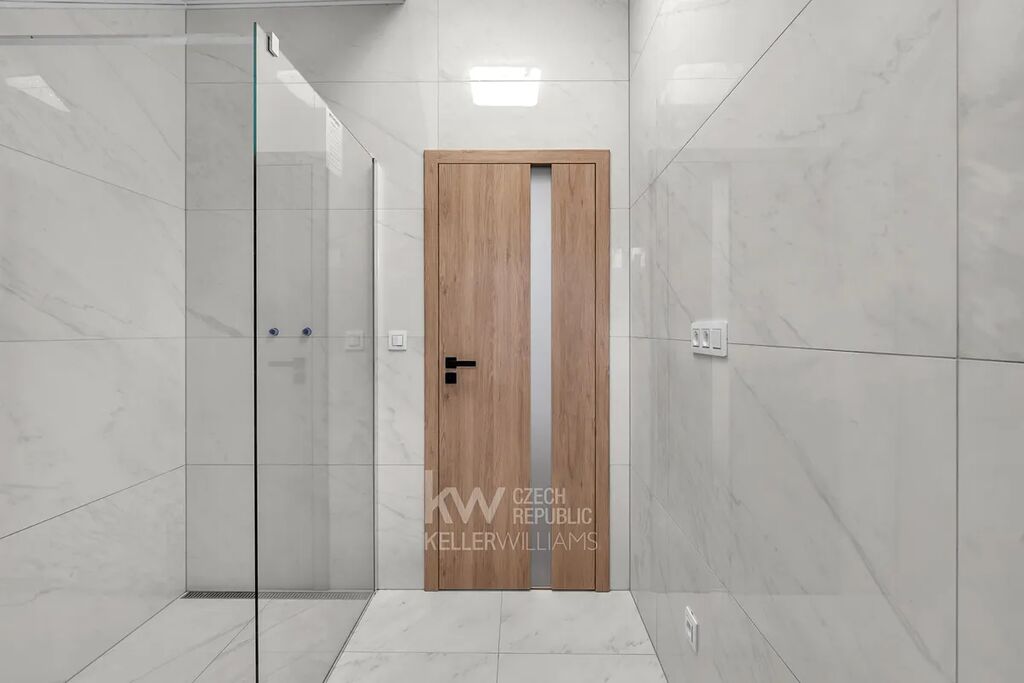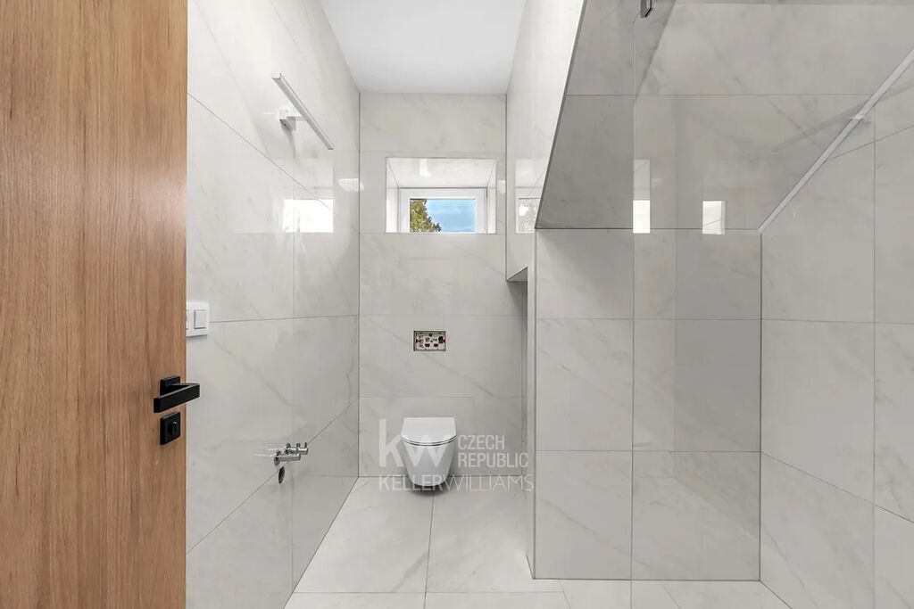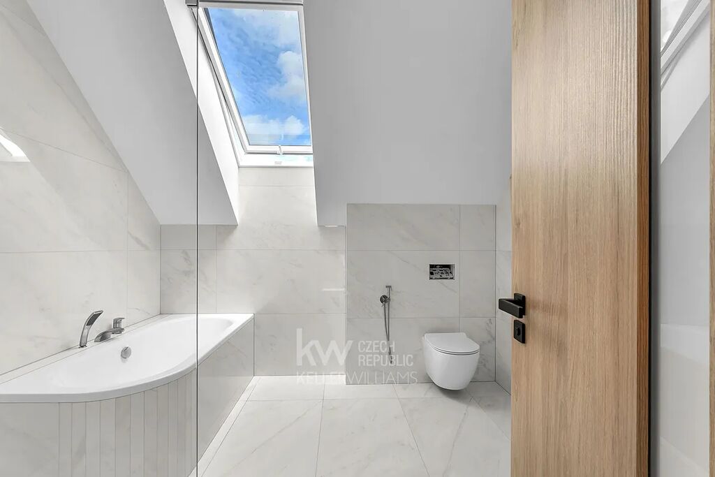 Do druhého patra vedou elegantní schody s Italským mramorovým obkladem, které jsou vybaveny automatickým senzorem osvětlení pro maximální komfort a bezpečnost. V horním patře se nacházejí čtyři samostatné, vzdušné pokoje s dostatkem přirozeného světla. Dva z nich mají velkorysou plochu 21,5 m² a další dva mají rozměry 15,9 m² a 17,8 m². Na patře se nachází také druhá koupelna, vybavená sprchovým koutem, vanou, WC a bidetovou sprchou, což poskytuje dostatek komfortu pro celou rodinu.