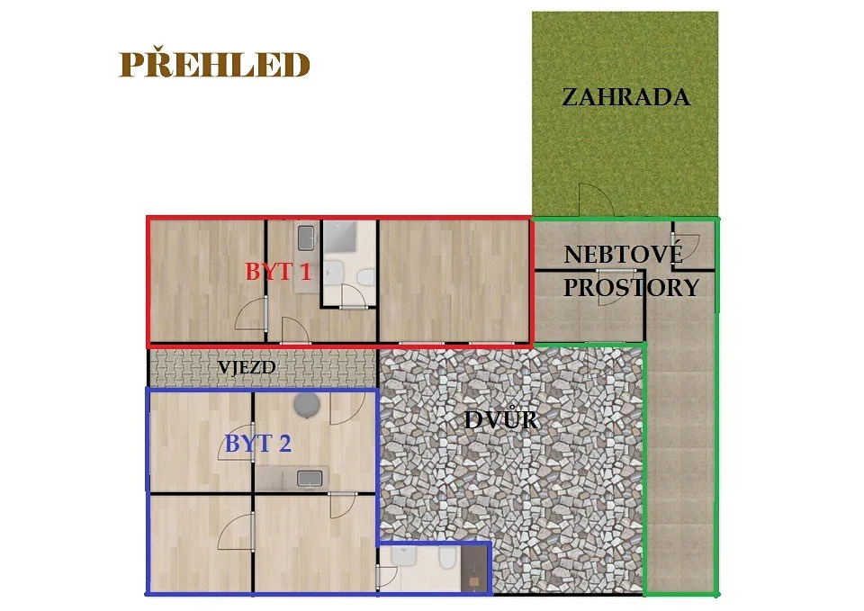 Dům se sedlovou střechou, pod kterou se nachází velká prostorná půda, se skládá ze dvou bytových jednotek o dispozici 2+1 a 3+1.