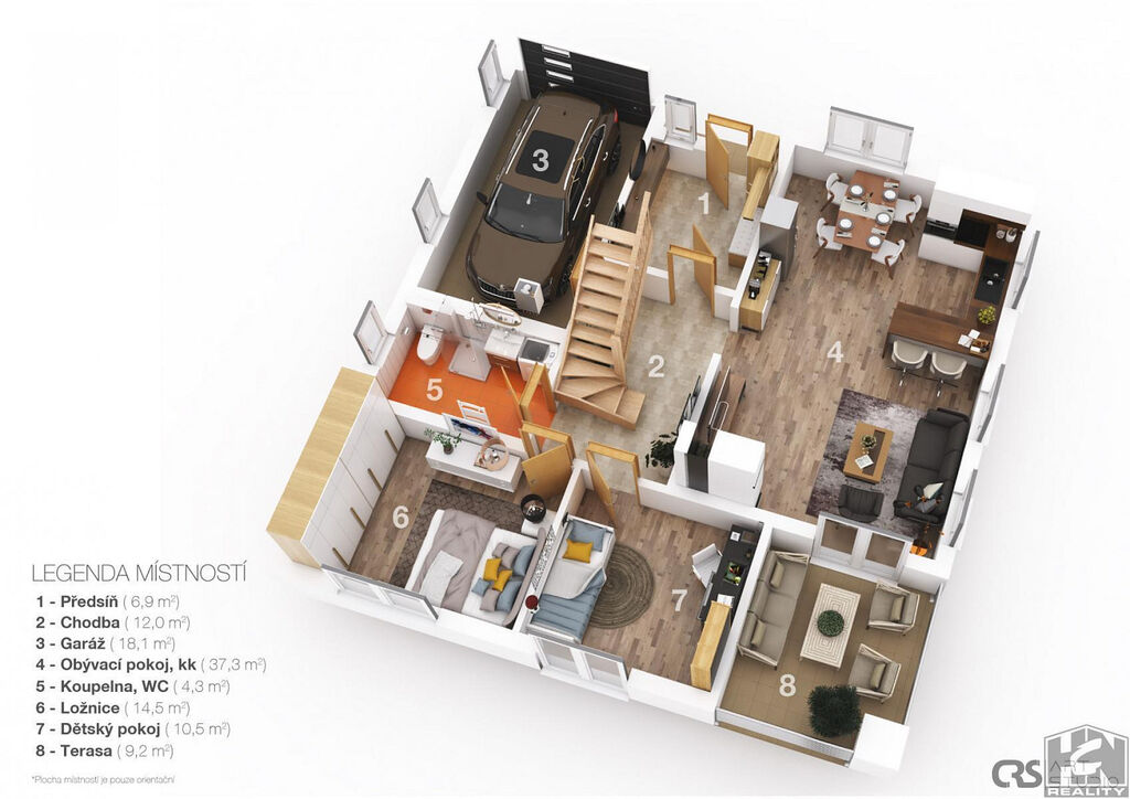Pozemek má celkovou rozlohu 873m². Zastavěná plocha 143m². Podlahová plocha domu s terasou 195m² + garáž 18m²+ terasa 9m². Dům je napojen na městský vodovod, veřejnou kanalizaci a elektřinu. V celém domě je ústřední topení s elektrickým kotlem, podlahové topení je v obyvacím pokoji s kuchyní, chodbě a koupelně v přízemí. Krb má vyvedeny teplovzdušné rozvody do 2. NP. Teplá voda je ohřívaná solárním systémem. Okna v domě v každé obytné místnosti mají vnitřní stínící rolety a venkovní elektrické hliníkové rolety. Fasáda domu je částečně obložena červenými cihelnými pásky. Energetický průkaz PENB třida: F.