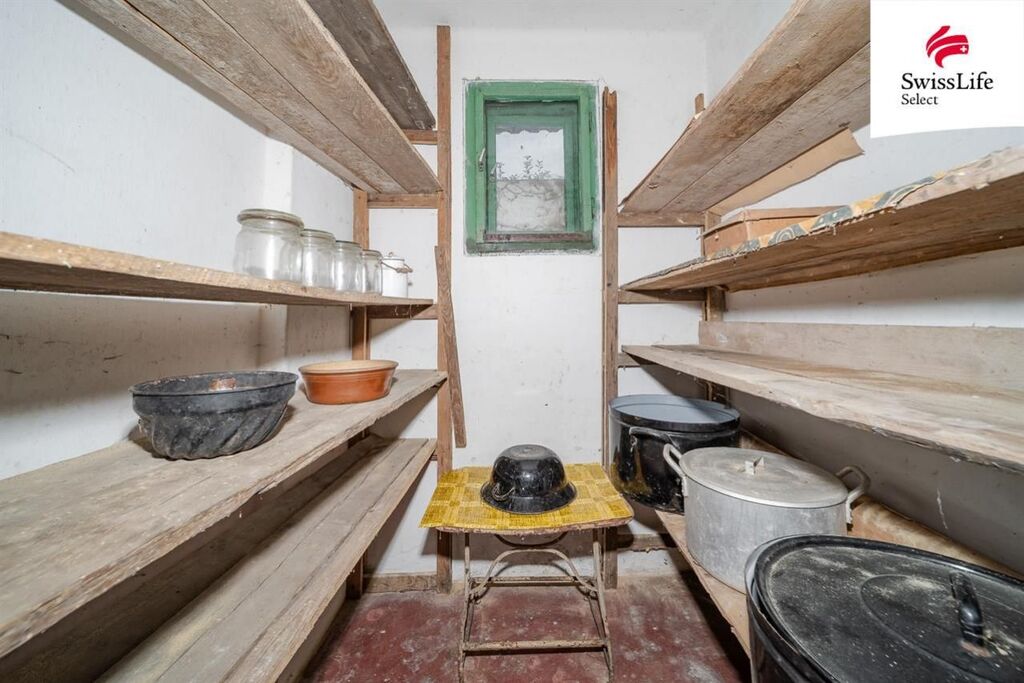 Střecha domu je plně funkční a pokud se zde začne zase topit a větrat a vymění se problematický kus podlahy v jídelně, bude tu i sucho. Radost Vám udělá snadná možnost napojení se na obecní vodovod i kanalizaci, která je přímo v cestě na hranici pozemku, než se do toho pustíte, tak je Vám k dispozici současné řešení- vlastní studna a jímka. Sklep je mimo dům- pod špejcharem s dílnou.