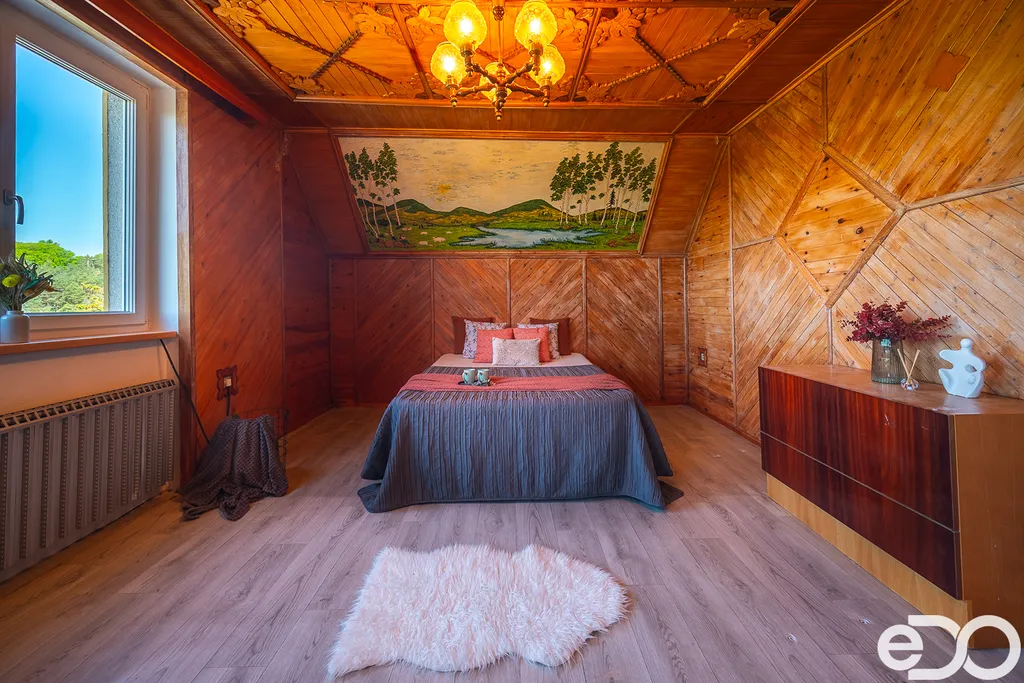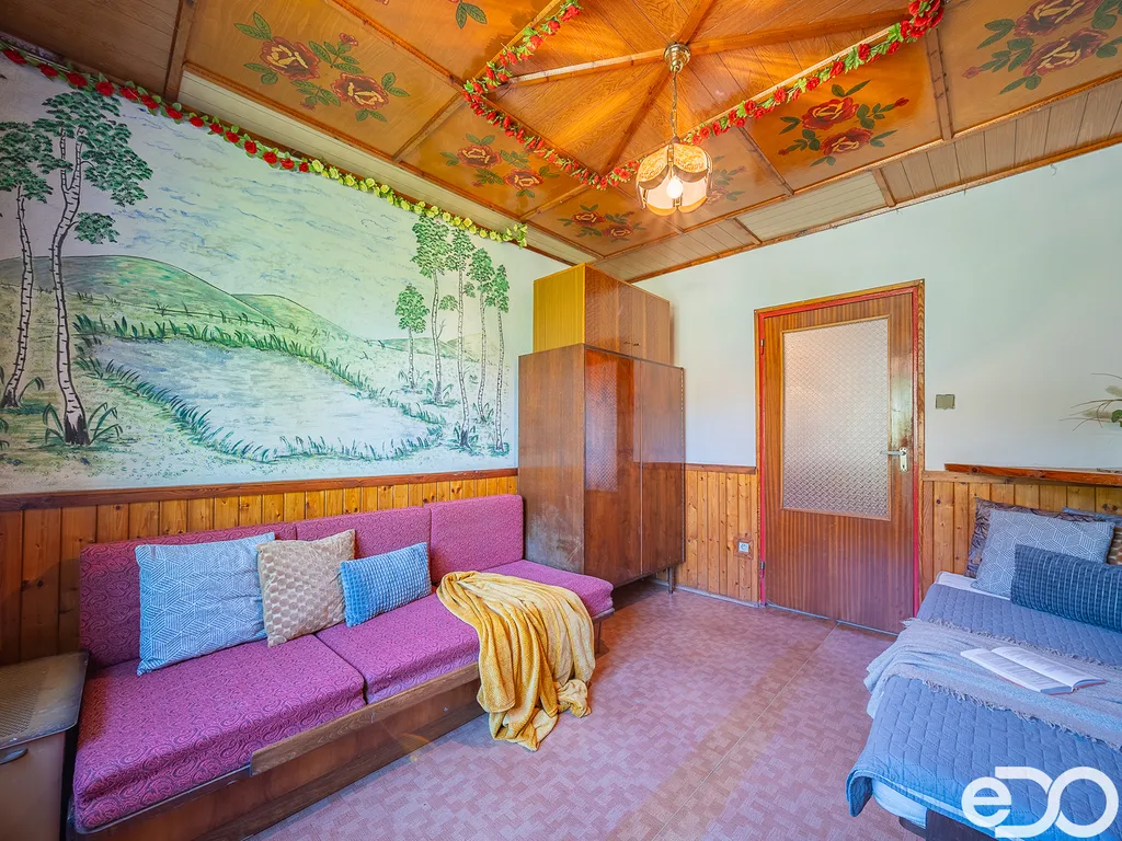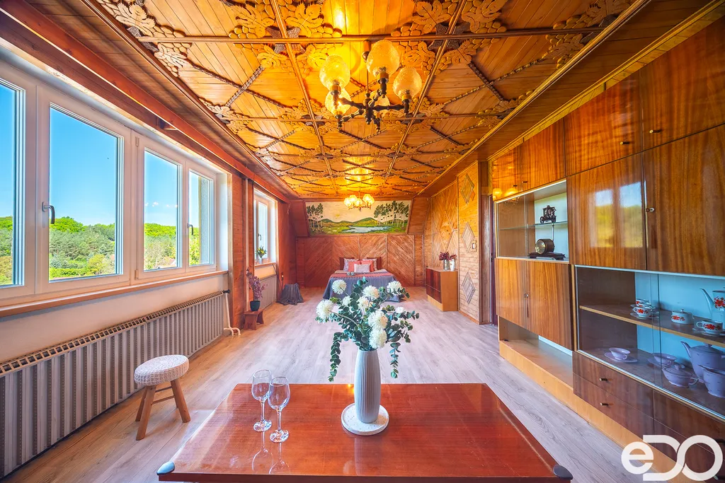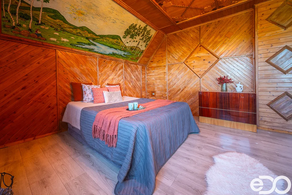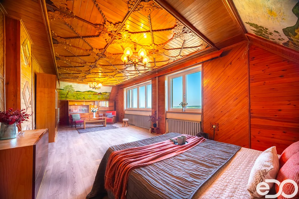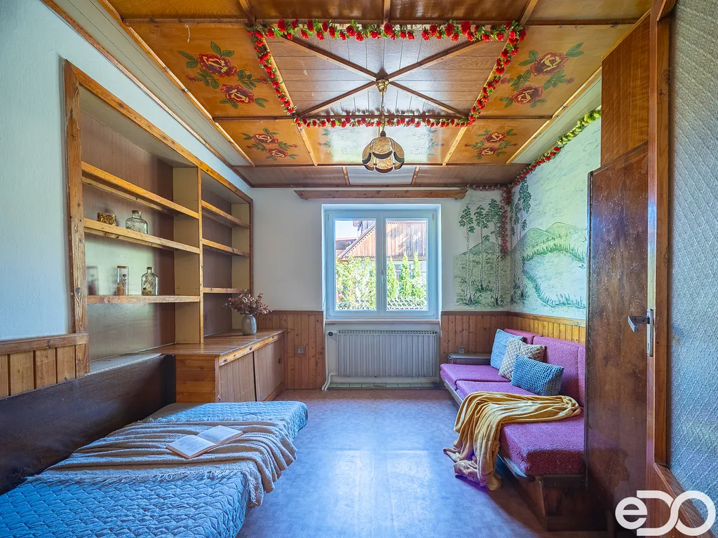 Zvenku působí jako součást přírody. Uvnitř vypráví příběh poctivé práce – ručně opracované dřevo, malby na stěnách a atmosféra, kterou nové stavby jen těžko napodobí.