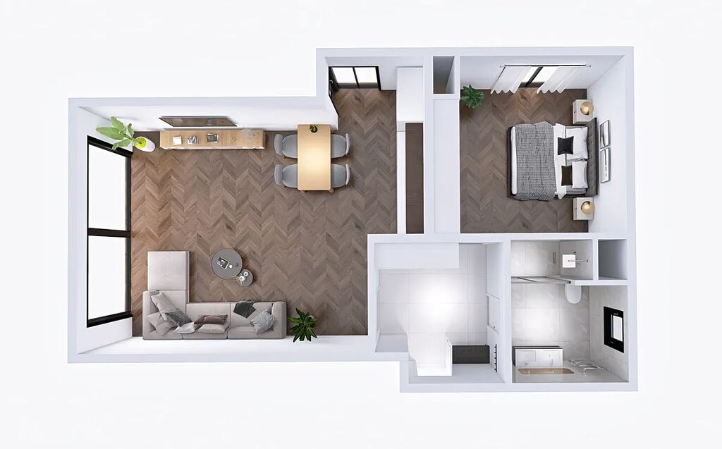 Byt se nachází ve 3.NP. Skládá se z předsíně, koupelny se sprchovým koutem a WC, ložnice a prostorné obývací místnosti s kuch. linkou. Dominantním prvkem interiéru jsou velkoformátová okna značky Schüco s jižní orientací. Okna byt krásně prosvětlují a nabízí krásný výhled na Prahu. Pro dosažení optimální světelné a tepelné pohody jsou okna opatřena automatickými venkovními žaluziemi. Vybavení bytu je nadstandardní. Je zde masivní dřevěná dvouvrstvá podlaha v rustikálním designu, velkoformátová keramická dlažba v mramorovém dekoru, designová kuch. linka od společnosti Hanák s vestavěnými spotřebiči AEG, vodovodní baterie HansGrohe, 2 vestavěné skříně, videotelefon, bezpečnostní dveře, chladící stropy, podlahové topení, SMART ovládání domácnosti od Loxone. Zdrojem vytápění je vlastní plynová kotelna.