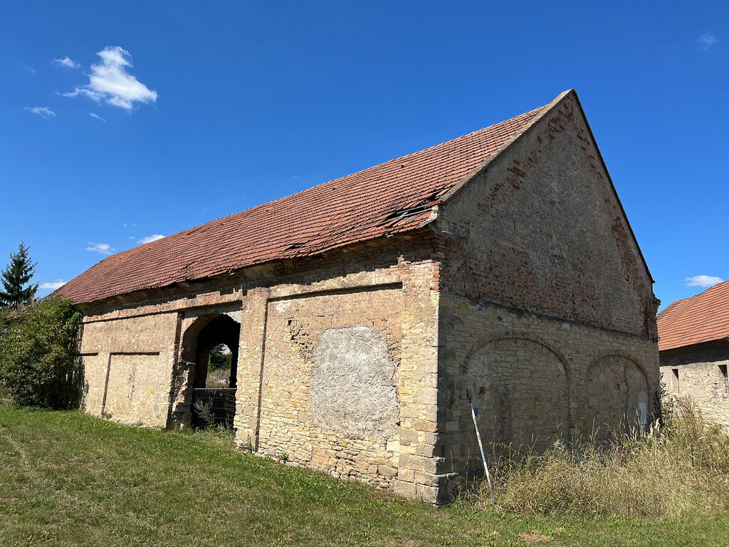 Součástí areálu je i dvoulodní stodola z pískovce se zaklenutými vjezdy a členěným štítem. Stodola je kryta sedlovou střechou s pálenými taškami, štíty mají nízkou nadezdívku z cihel. Kamenná zeď uzavírá dvůr a navazuje na starší zdivo s úzkým štěrbinovým okénkem.