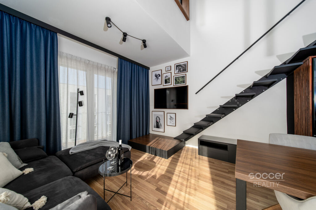 Byt je řešen s důrazem na design a praktičnost. Vysoké stropy dodávají prostoru vzdušnost, galerie vytváří útulnou ložnici, moderní kuchyňská linka na míru a elegantní schodiště podtrhují jedinečný styl loftového bydlení. Z obývacího pokoje je vstup na balkon s příjemným výhledem. Součástí je koupelna se sprchovým koutem a WC a prostorná předsíň. V bytě nainstalováno "inteligentní osvětlení" - T-led a "inteligentní vytápění" – Netatmo.