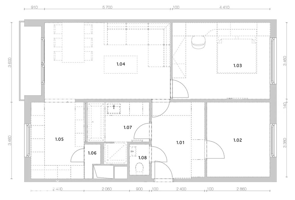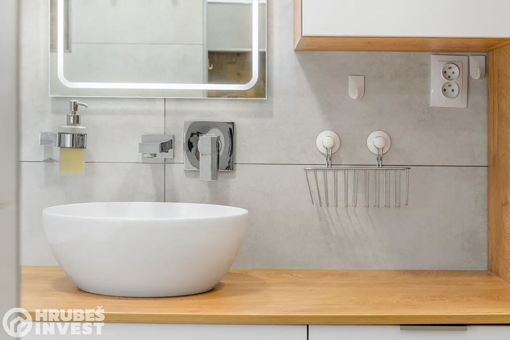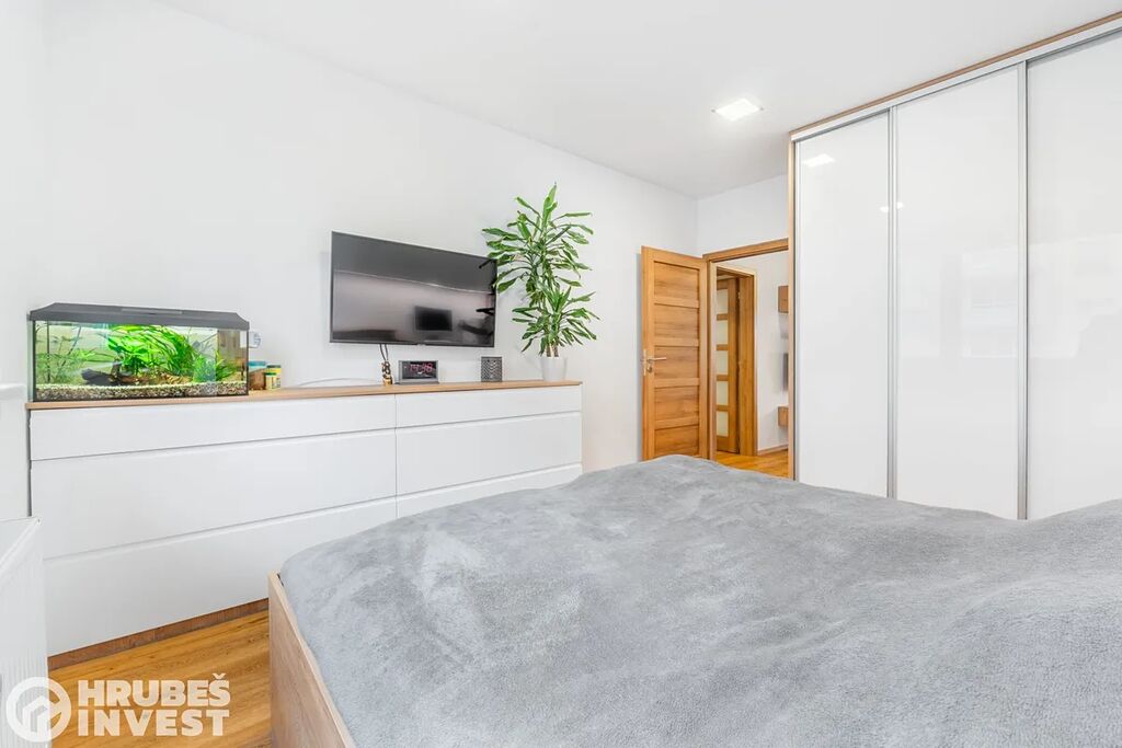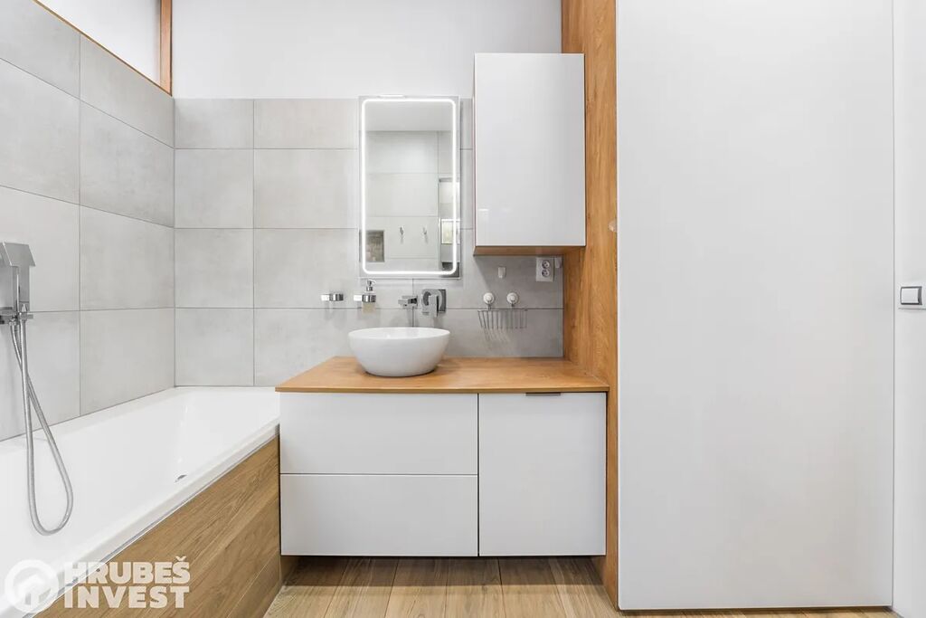 Byt o dispozici 3+kk se nachází v 5. nadzemním podlaží panelového domu s výtahem, který prošel kompletní rekonstrukcí v roce 2019. Tady je opravdu vše promyšlené do detailu – od vestavěných skříní, skryté komory až po elegantní koupelnu, kde najdete vanu i sprchový kout.