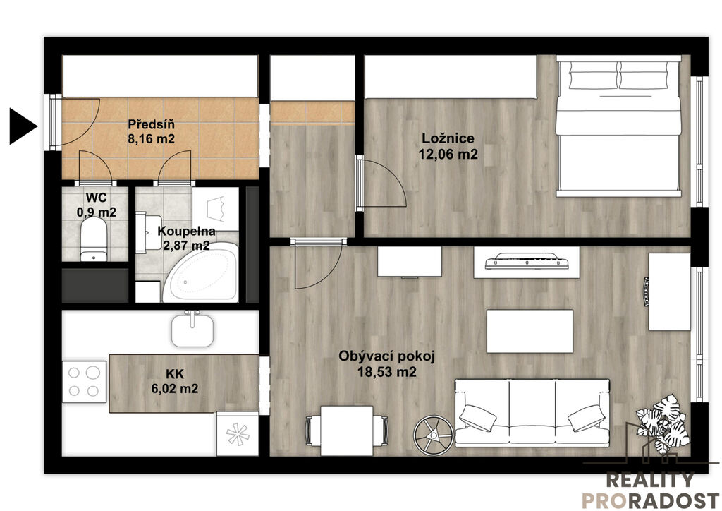 Byt je po rekonstrukci, v excelentním stavu a navíc byl doposud užíván pouze majiteli – což je na jeho kvalitě opravdu znát. Obývací část s kuchyňským koutem je díky jižní orientaci prosvětlená a zároveň poskytuje klid a soukromí. Okna do vnitrobloku. Moderní kuchyň je vybavena kvalitními spotřebiči pro pohodlné vaření a obývací pokoj nabízí dostatek prostoru jak pro odpočinek, tak i společenské chvíle. Samozřejmostí je dálkové ústřední vytápění a možnost internetové připojení. V bytě je dostatek úložného prostoru - velké vestavěné skříně na chodbě i v ložnici.