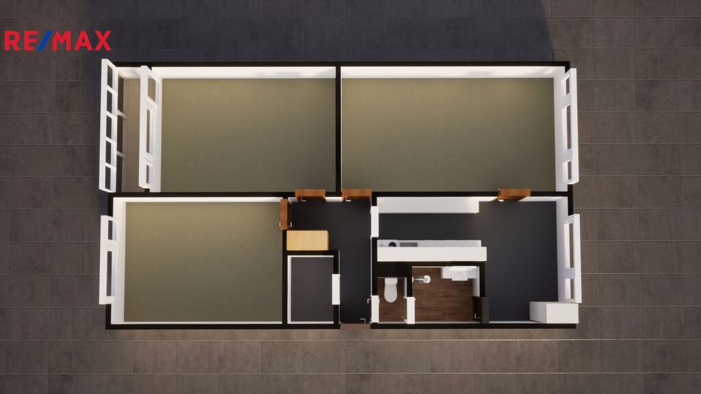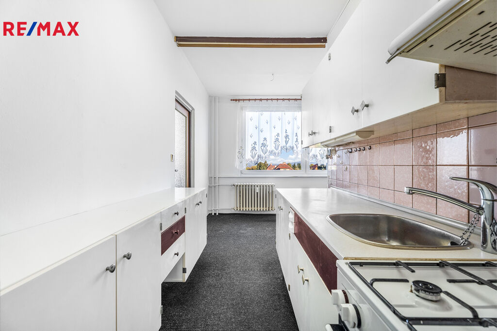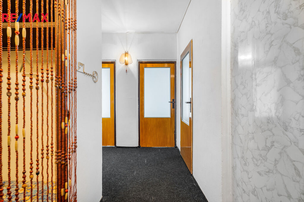 • Praktická dispozice: Chodba, komora, koupelna a samostatné WC, kuchyň, dva pokoje a prostorný obývací pokoj s přístupem do kuchyně a chodby.