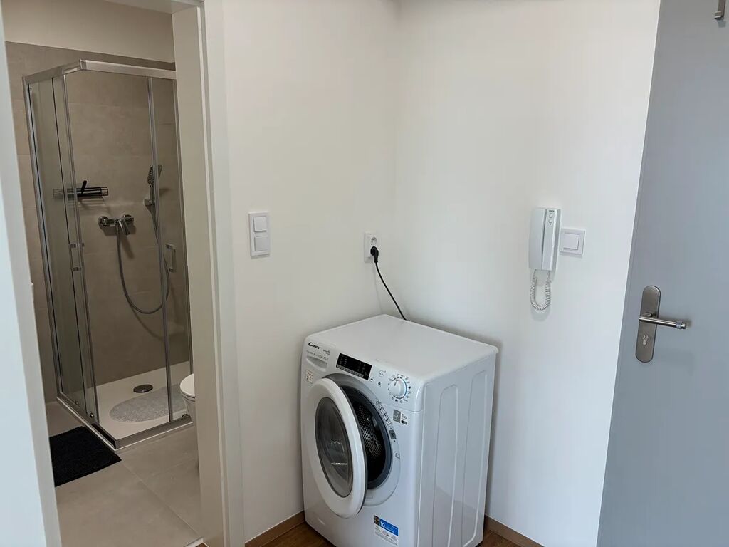 Byt disponuje obývacím prostorem s kuchyňským koutem, plně vybavenou kuchyňskou linkou včetně spotřebičů (myčka, varná deska, trouba, digestoř, lednice s mrazákem, led osvětlení), kombinovanou pračkou se sušičkou, jídelním stolem a židlemi. Po vzájemné dohodě s majitelem je možné byt dozařizovat. Součástí je také koupelna se sprchovým koutem a toaletou. Botník na chodbě. K bytu náleží sklepní kóje v suterénu domu.