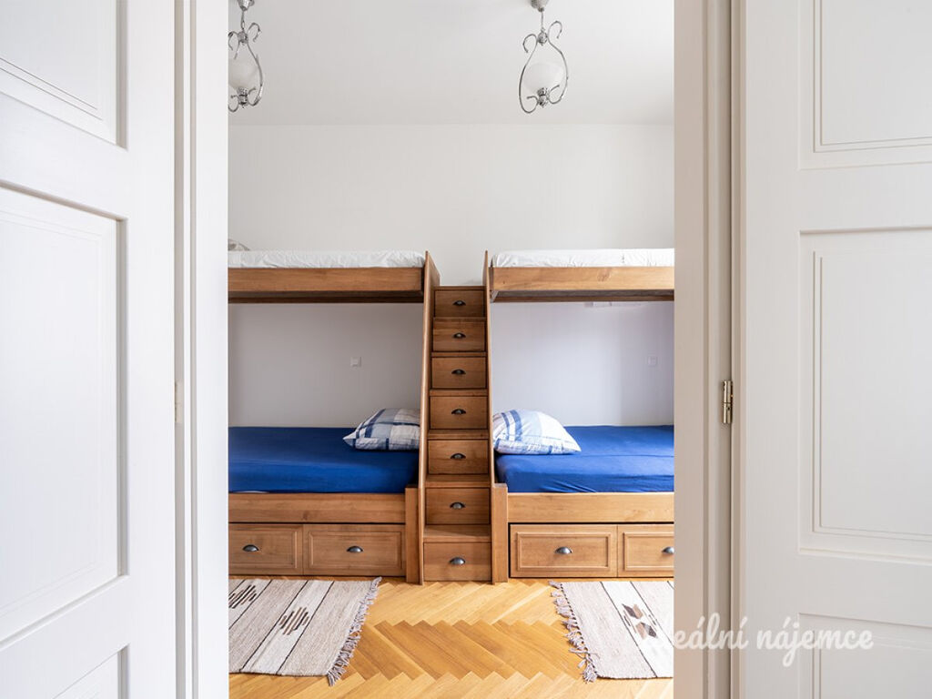 Byt je plně vybavený, takže se můžete ihned nastěhovat bez nutnosti dalšího zařizování. Kuchyně je vybavena lednicí, elektrickou a mikrovlnnou troubou, digestoří a myčkou nádobí. V obývací části najdete pohodlnou sedací soupravu, konferenční stolek, jídelní kout i televizi. Samostatný pokoj disponuje dvěma patrovými postelemi. Koupelna je zařízena sprchovým koutem, umyvadlem a toaletou, k dispozici je také pračka.
