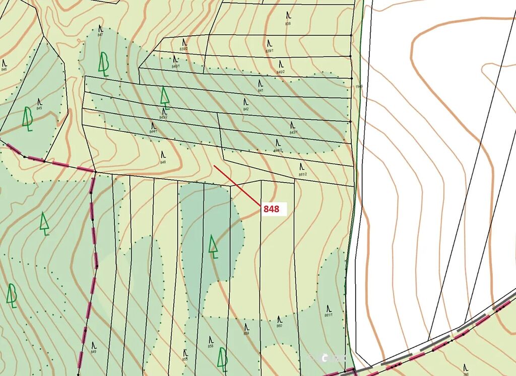 Lesní pozemek o výměře 2 338 m2, parcelní číslo 848, podíl 1/1, katastrální území Vranín, obec Moravské Budějovice, obec s rozšířenou působností Moravské Budějovice, okres Třebíč, Kraj Vysočina. Po těžbě.