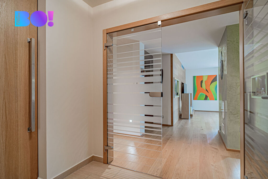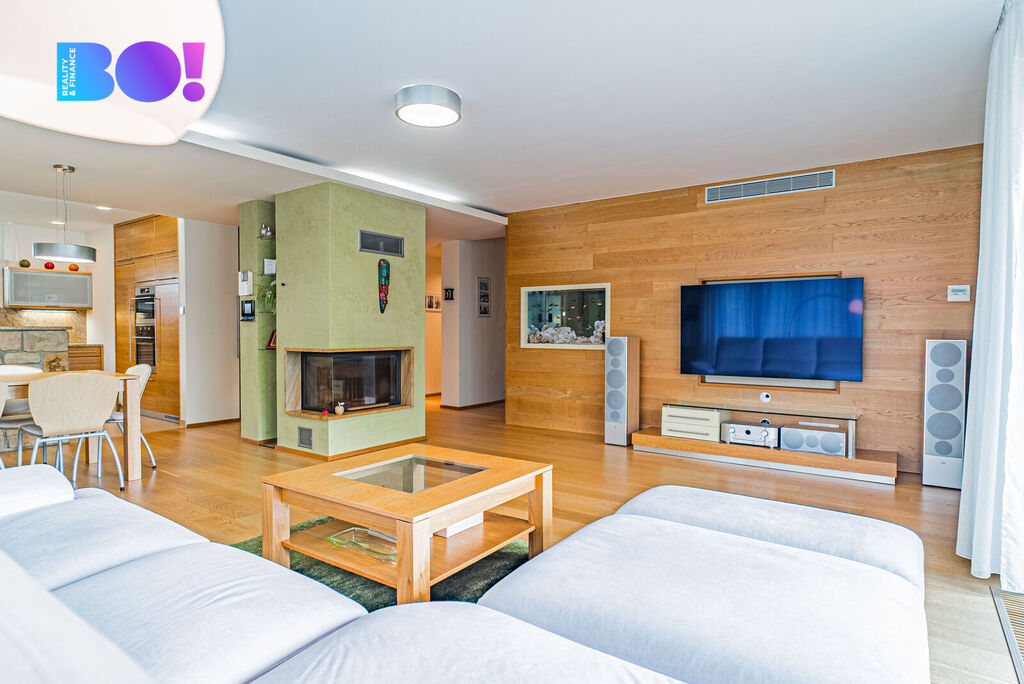 Příjemnou atmosféru v domě tvoří jednotný koncept volby přírodních materiálů jako jsou dřevěné schody, podlahy či zárubně s dveřmi z masivu, kuchyňská linka včetně ostrůvku osazená žulovou deskou, krb na dřevo či netradičně zabudované akvárium ve stěně obývacího pokoje. Veškeré skříně jsou na míru a poskytují dostatek úložných prostor. Součástí prodeje jsou také umělecká díla na stěně v prostoru schodiště, jež byla speciálně navržena pro tento prostor.