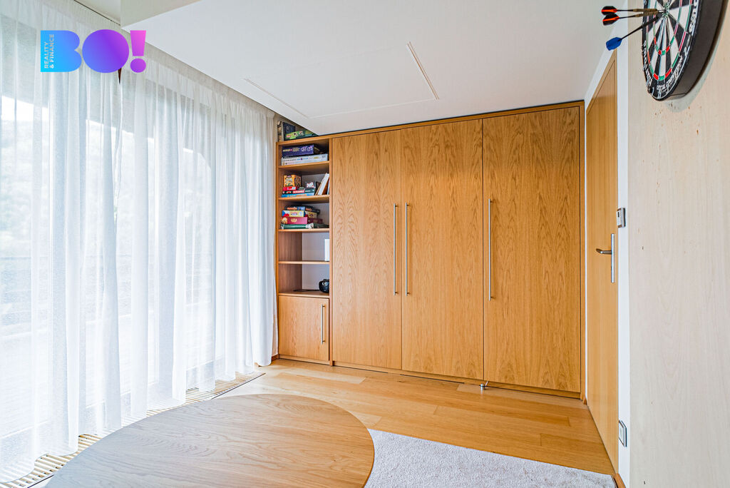 Přestože dům z cesty nevypadá příliš velký, opak je pravdou. Architekt zde odvedl perfektní práci a skvěle zabudoval dům do svažitého terénu takže i spodní patro je plnohodnotné. Najdete zde 5 pokojů (ložnice a 3 samostatné pokoje v 2.NP, 1 pokoj v 1.NP), 2 koupelny, obývací prostor spojený s kuchyní s výstupem na krytou terasu, dále pak pracovnu v suterénu, saunu, technickou místnost a drobné prostory pro úklid či spíž.