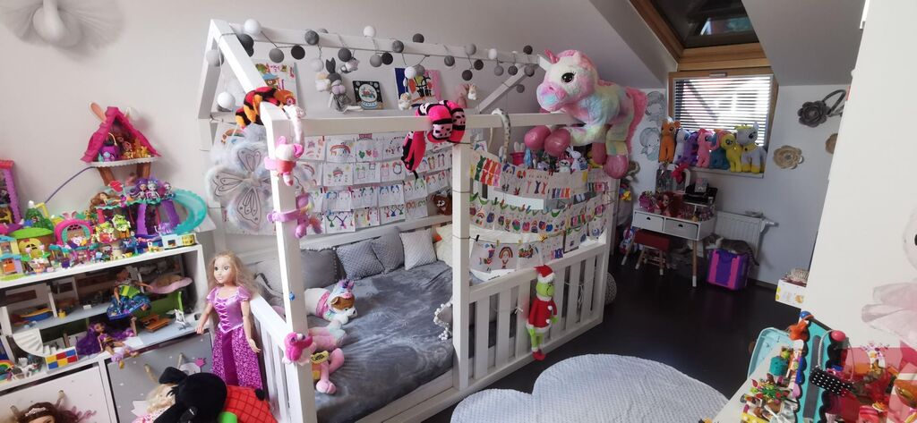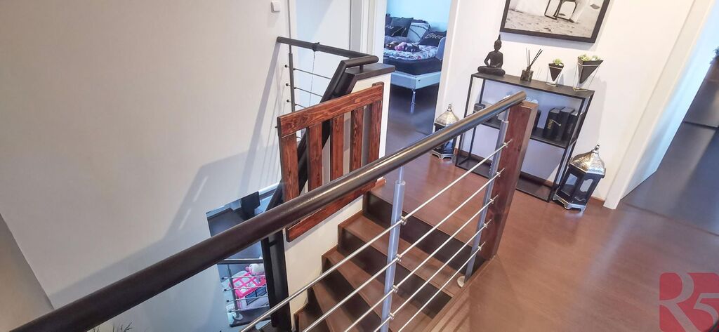V prvním patře se nachází čtyři pokoje, které jsou nyní využívány jako ložnice, pracovna, dětský pokoj se šatnou a čtvrtý pokoj přestavěný na prostornou šatnu. Okna jsou vybavena venkovními elektrickými žaluziemi, včetně střešních, což zajišťuje soukromí, tepelnou pohodu a bezpečnost.