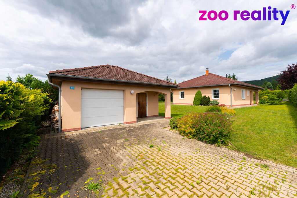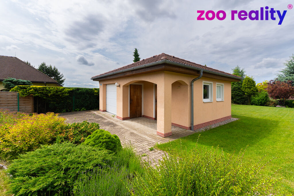 Dům má velmi dobře promyšlenou dispozici 4+kk. Obytný prostor tvoří světlý a vzdušný obývací pokoj s krbem, navazující jídelní kout a kuchyň s oknem do zahrady. Z obývací části je přímý vstup na krytou terasu s výhledem do zeleně. Dále jsou k dispozici dvě ložnice, pracovna, koupelna s vanou a sprchovým koutem a samostatná toaleta. Vstupní hala je vybavena vestavěnými skříněmi. Součástí domu je rovněž garáž a menší dílna.