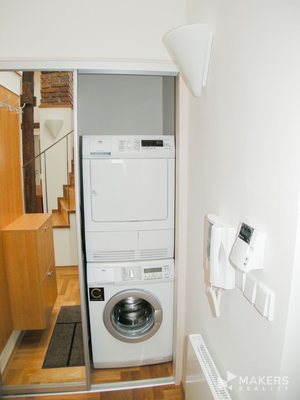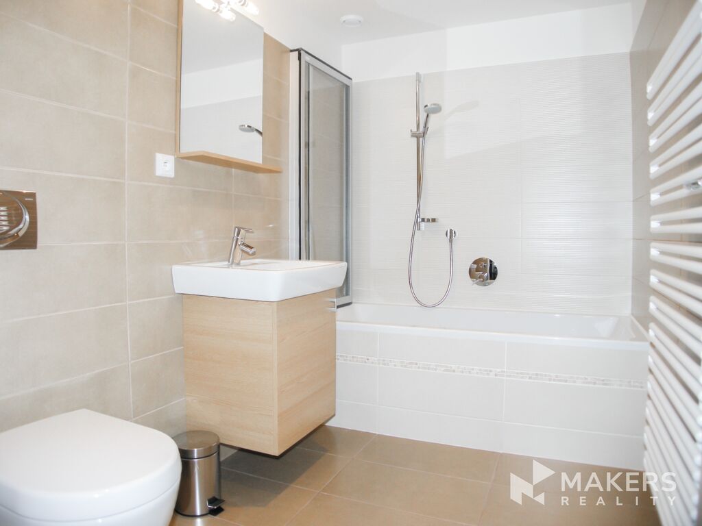 Byt sestává z obývacího pokoje, spojeným s jídelnou a moderním kuchyňským koutem (trouba,el. varná deska, mw trouba, digestoř, lednice, myčka, drtič odpadu), který je vhodně umístěn v rohu místnosti a tím oddělen od zbylé části obývacího pokoje, dale pohodlnou sedací soupravou a TV. V ložnici najdete velkou manželskou postel a dostatek uložných prostorů. Pracovna s krásným výhledem na Prahu je umístěna na galerii. Koupelna je vybavena vanou a toaletou. V předsíni jsou další úložné prostory.