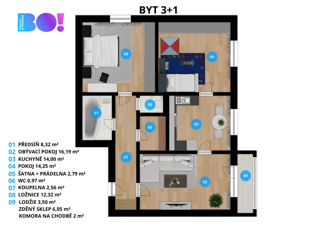 Dispozice 3+1 s podlahovou plochou 71,4 m² umožňuje opravdu pohodlné bydlení. Praktická je navíc i samostatná místnost na pračku a domácí prostředky. K tomu je možné v obývacím pokoji využít zasklený balkon o velikosti 3,5 m².