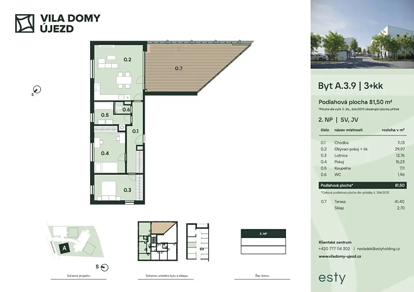 S plochou 81,5 m2 je ideální kombinací komfortu a funkčnosti. Byt se skládá z obývacího pokoje (29,97 m2), ložnice (13,76 m2), pokoje (15,23 m2), chodba (11,13 m2), koupelna (7,11 m2), samostatné WC (1,96 m2) a terasa (41,21 m2). K bytu náleží také sklep (2,7m2).