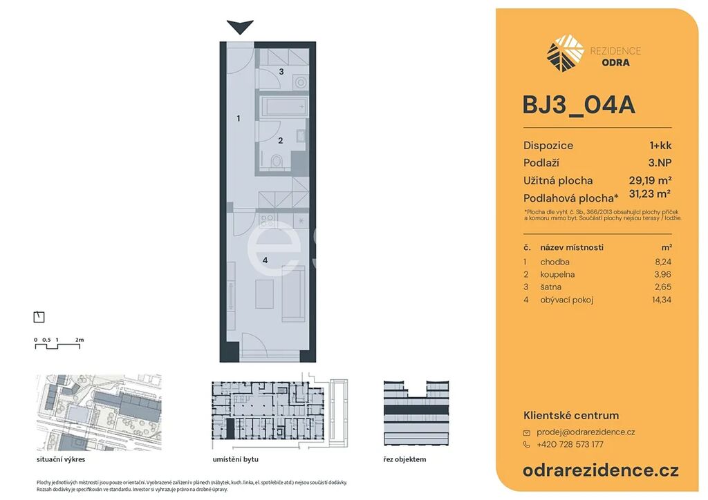 Hledáte nový domov v klidné a přitom skvěle dostupné lokalitě? Rezidence Odra je moderní projekt s duší i budoucností, který vzniká na místě bývalého obchodního centra v pražských Bohnicích. Nyní vám nabízíme konkrétní volnou jednotku 1+kk o ploše 31,23 m2, nacházející se ve 3. nadzemním podlaží budovy ve fázi dokončení.