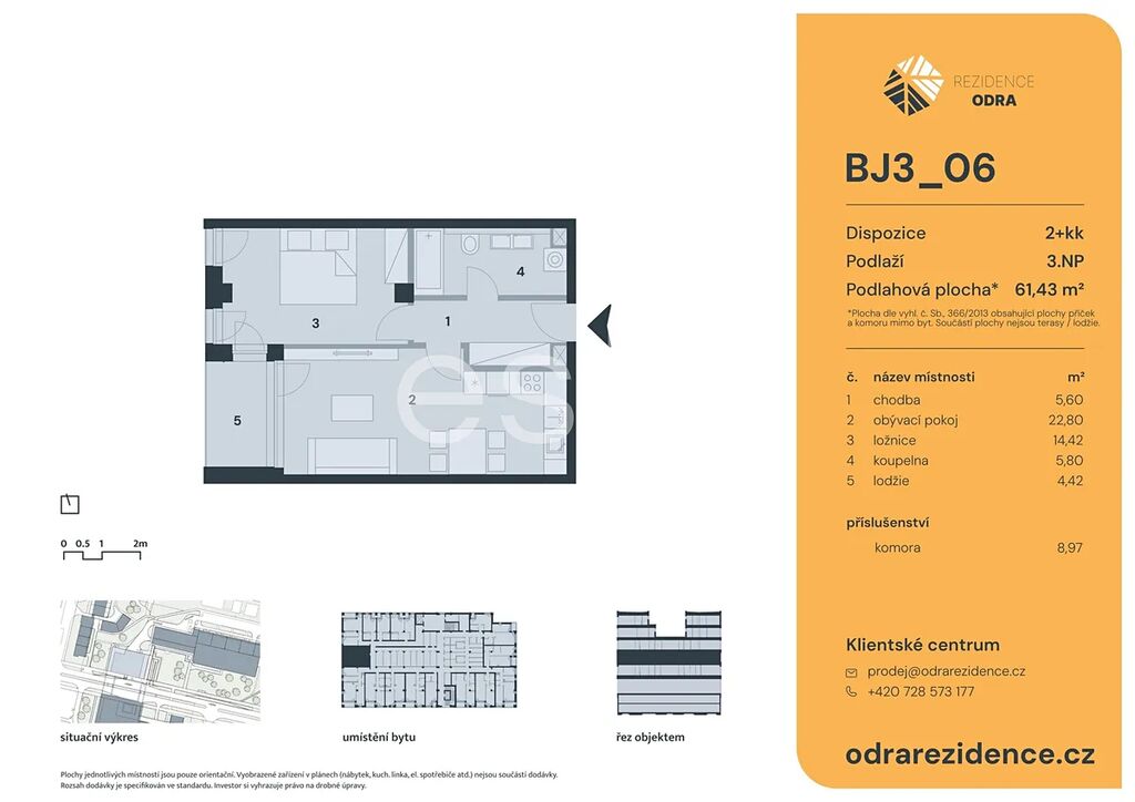 Hledáte nový domov v klidné a přitom skvěle dostupné lokalitě? Rezidence Odra je moderní projekt s duší i budoucností, který vzniká na místě bývalého obchodního centra v pražských Bohnicích. Nyní vám nabízíme konkrétní volnou jednotku 2+kk o ploše 61,43 m², nacházející se ve 3. nadzemním podlaží budovy ve fázi dokončení.