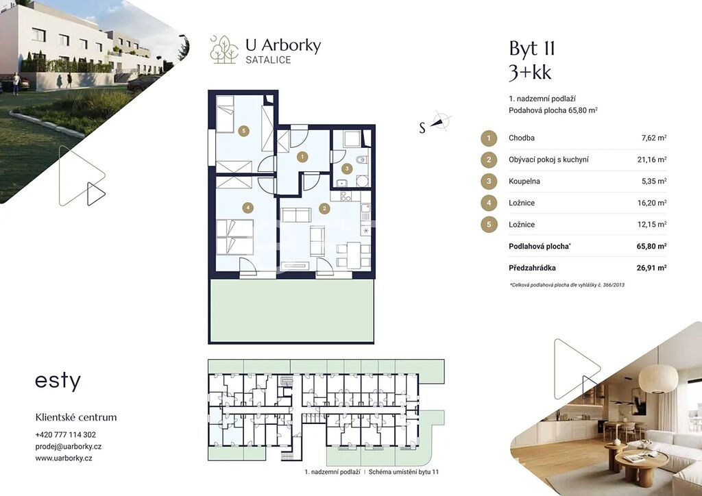 Tento byt se nachází ve 1. nadzemním podlaží a nabízí dispozici 3+kk s celkovou plochou 65,8 m²: