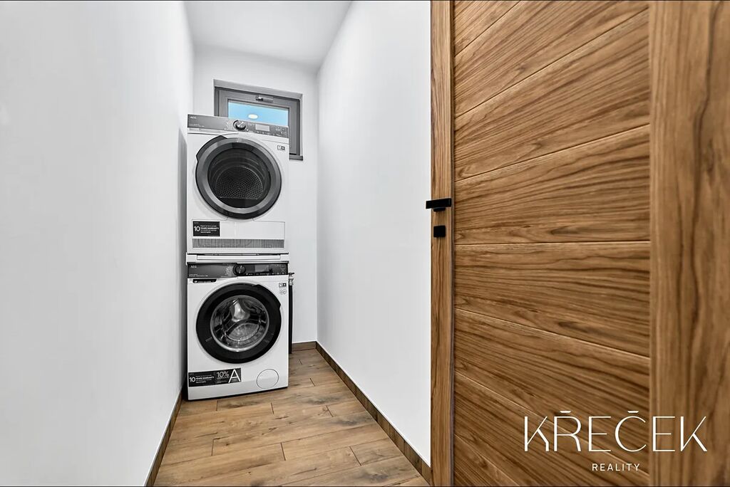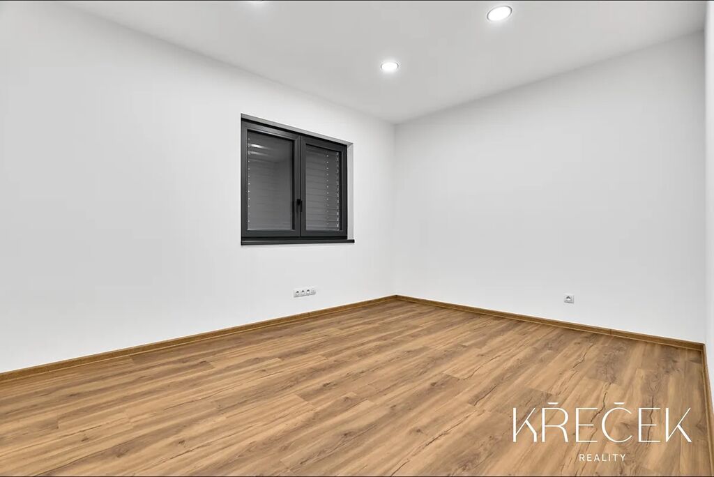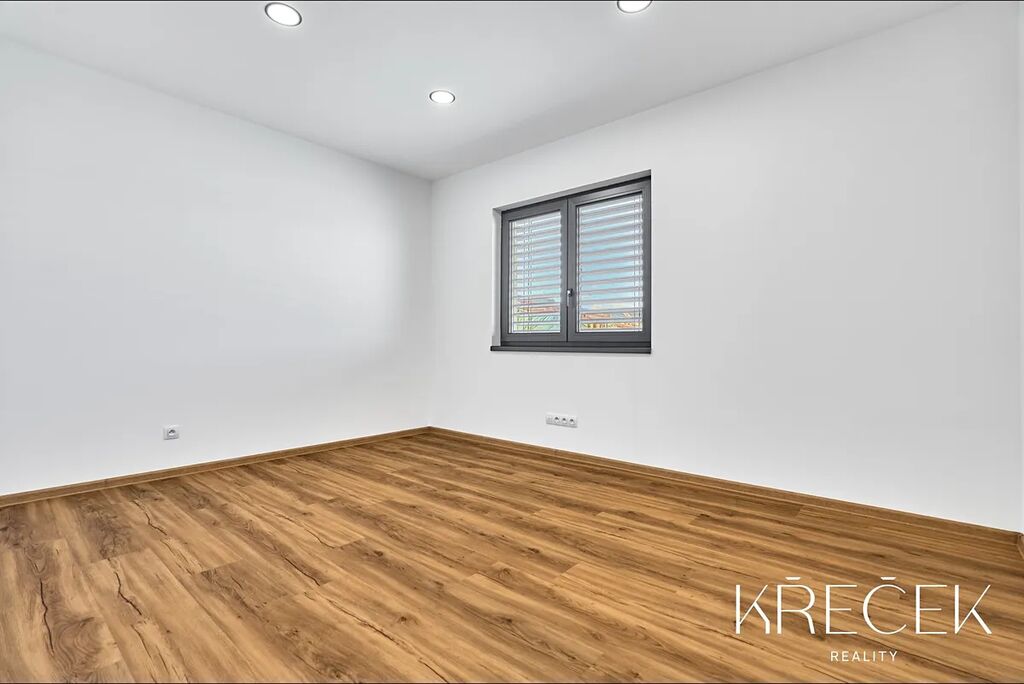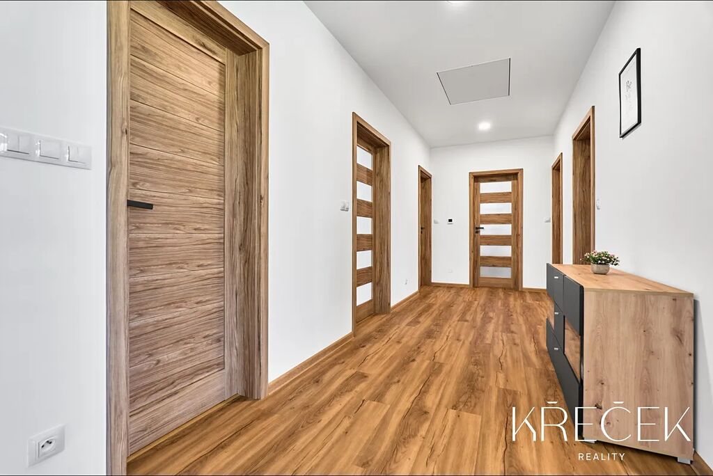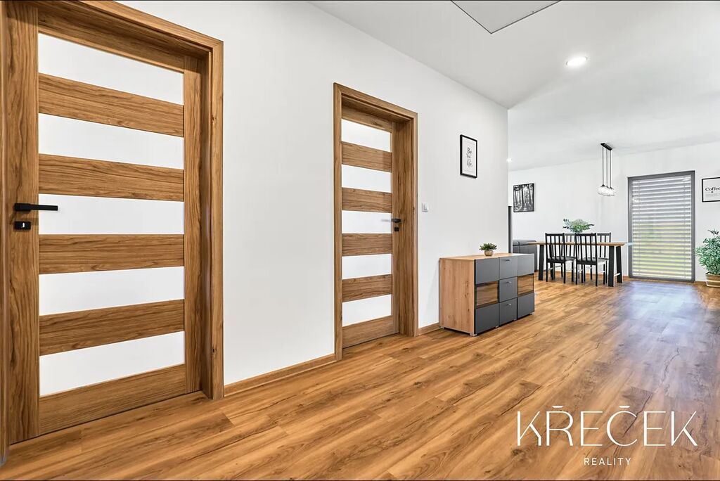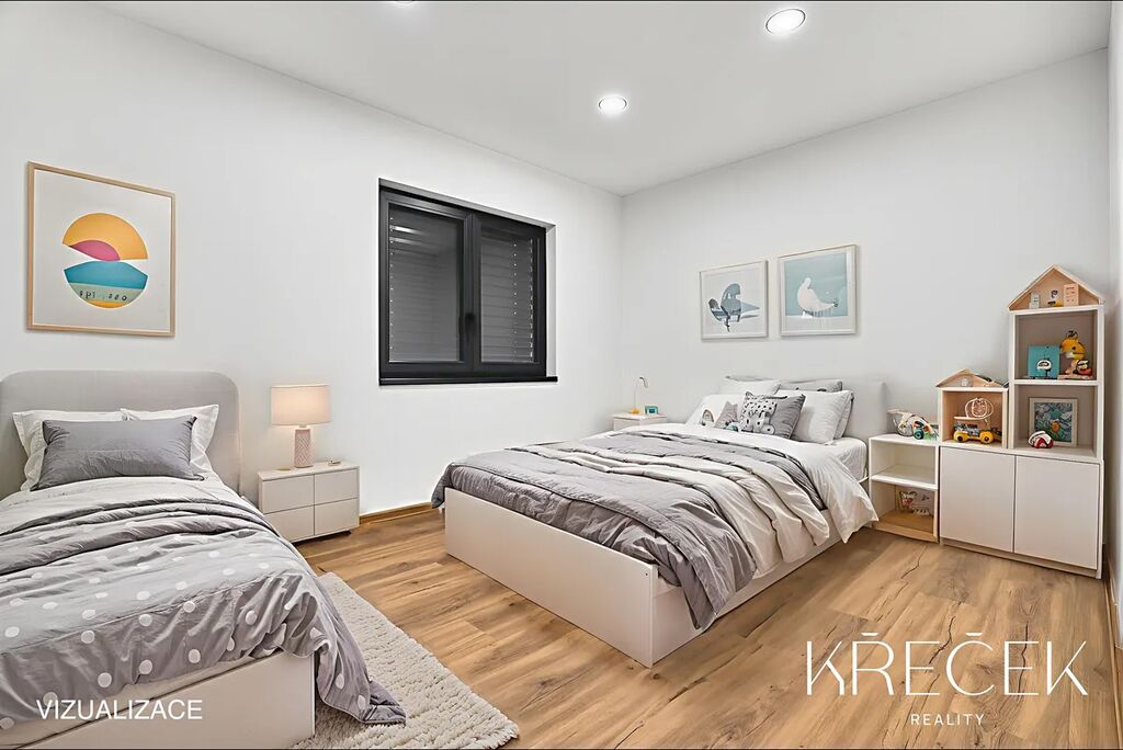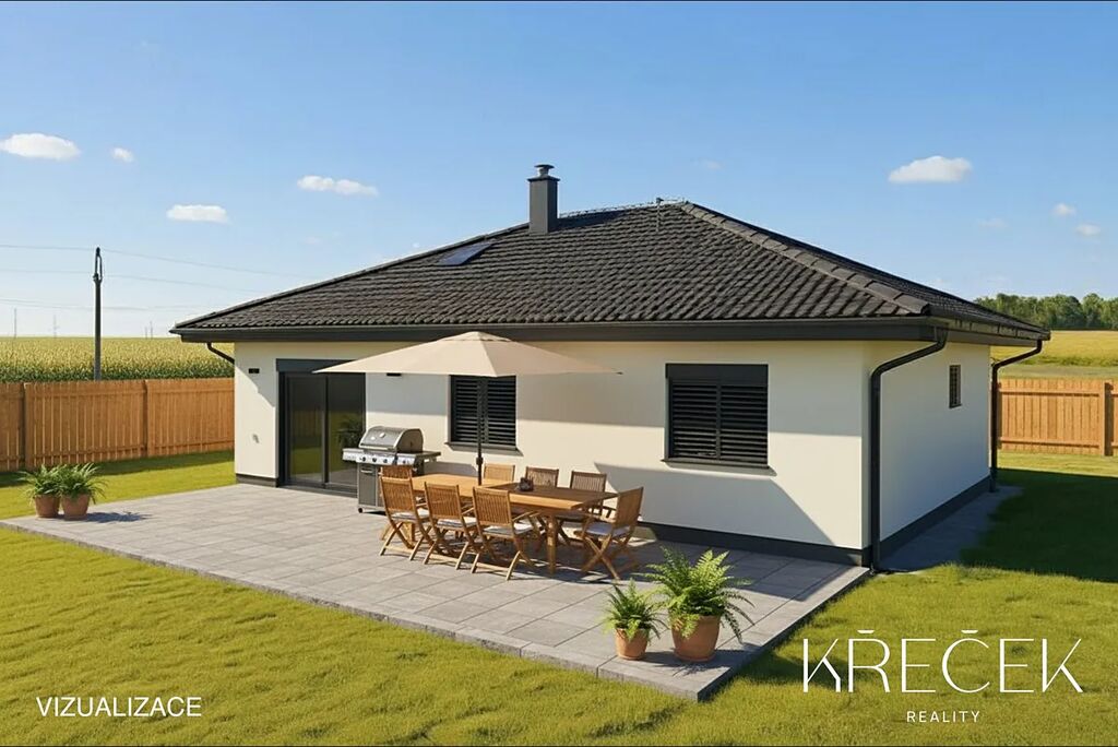 Dispozice 4+kk zahrnuje prostorný obývací pokoj spojený s kuchyní a jídelnou s HS portálem na zahradu, ložnici, dva samostatné pokoje, koupelnu a samostatné WC. Praktické zázemí doplňuje technická místnost/prádelna a úložný prostor s bojlerem umístěný za toaletou.