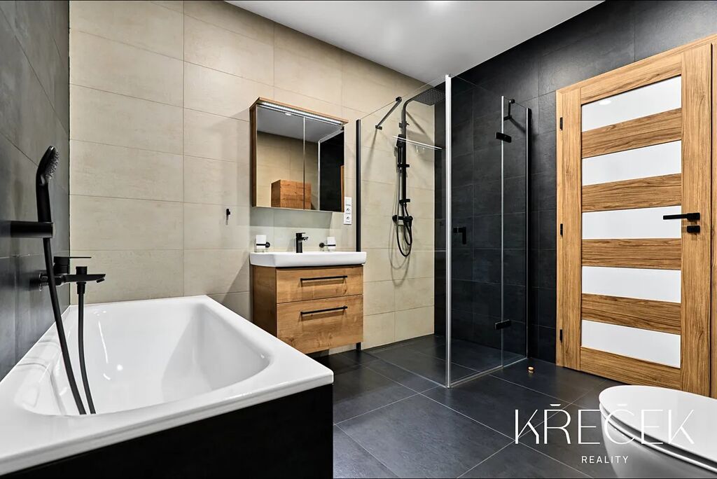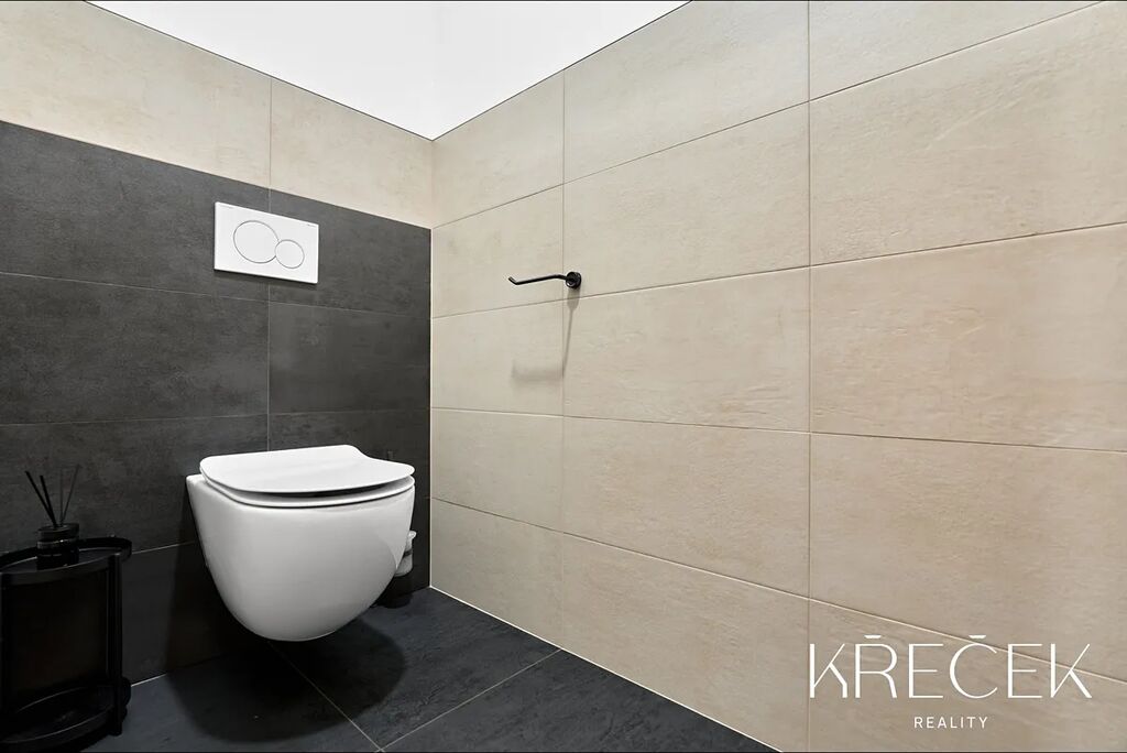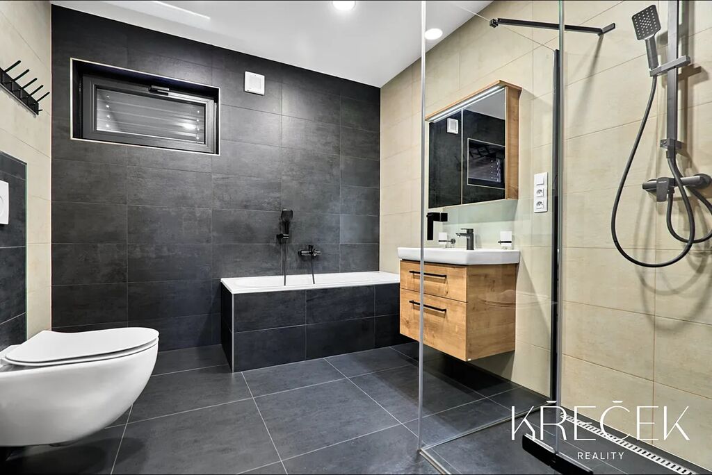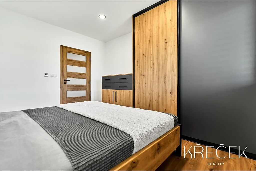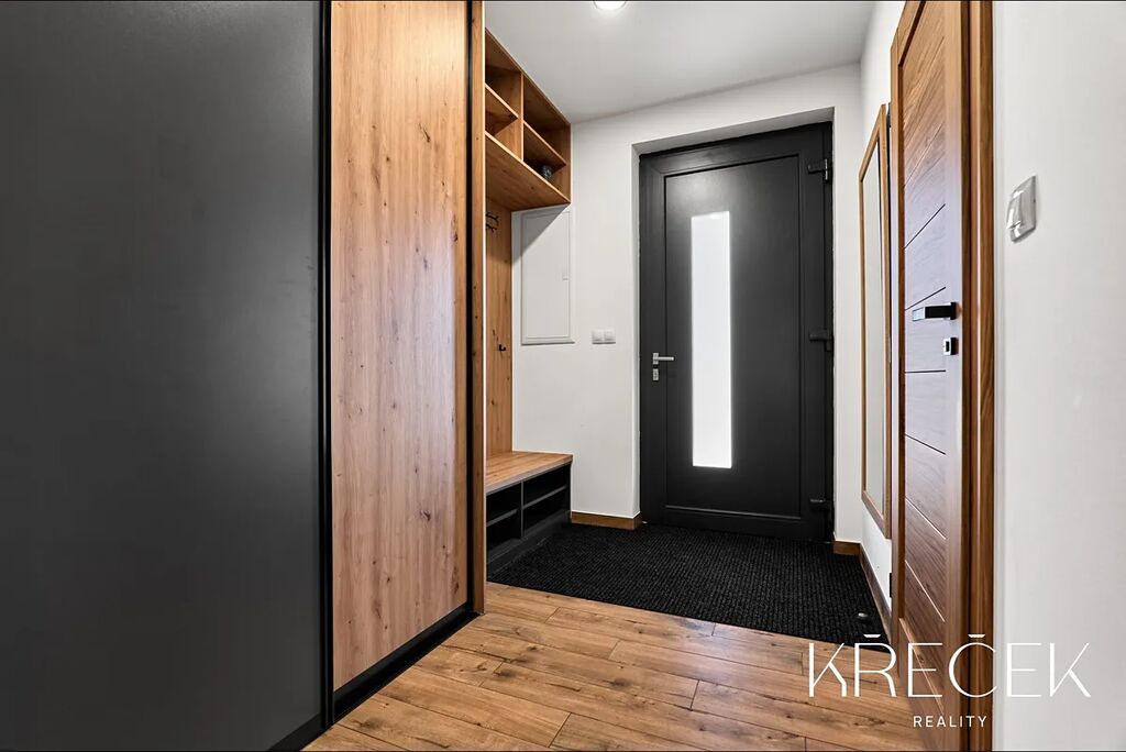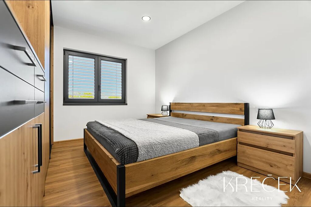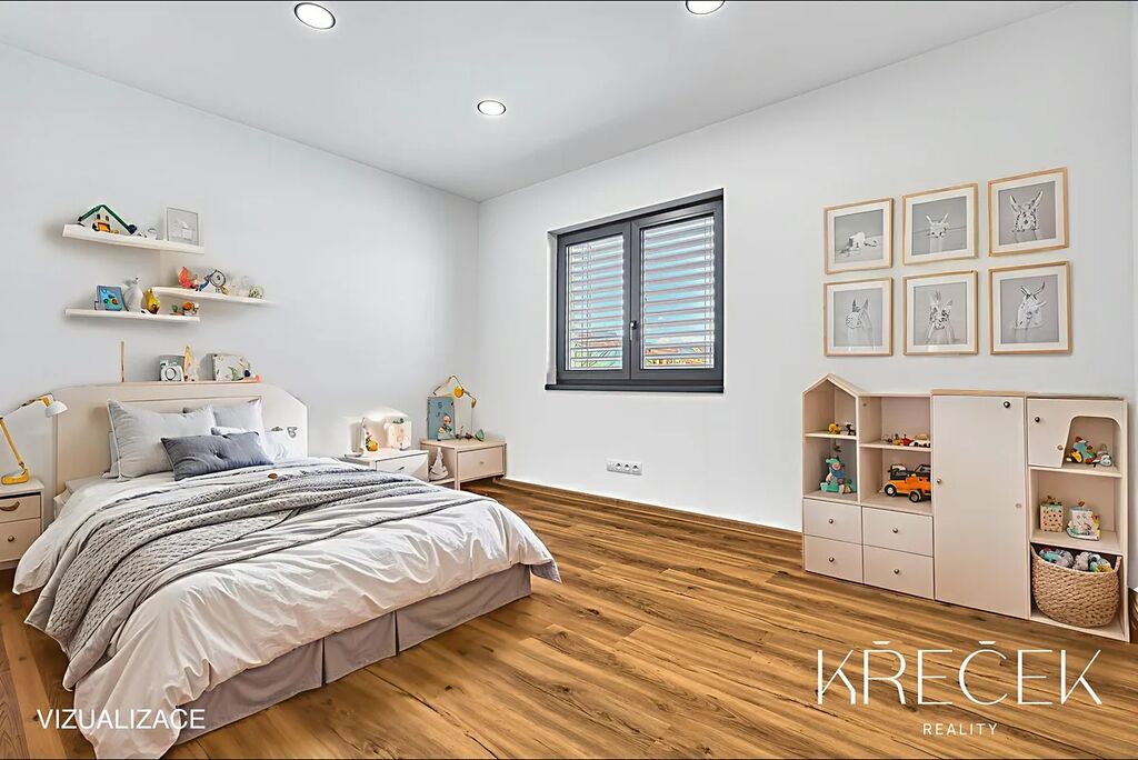 Dispozice 4+kk zahrnuje prostorný obývací pokoj spojený s kuchyní a jídelnou s HS portálem na zahradu, ložnici, dva samostatné pokoje, koupelnu a samostatné WC. Praktické zázemí doplňuje technická místnost/prádelna a úložný prostor s bojlerem umístěný za toaletou.