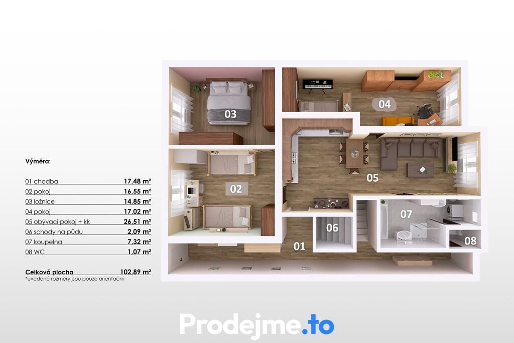 Dům tvoří vstupní chodba, prostorný obývací pokoj s vybaveným kuchyňským koutem, ložnice, dva další pokoje, koupelna se sprchovým koutem i vanou a samostatná toaleta. Součástí domu je také praktický suterén o ploše 27 m2, který je rozdělený na dvě sklepní místnosti a prádelnu. V roce 2005 prošel rekonstrukcí – nové podlahy, sanace omítek, nové zdivo i odvětrání do dvora. Díky tomu je dnes suchý a spolehlivě slouží k uskladnění nebo dalšímu využití. Další bonus představuje půda o rozloze 55 m2 s vysokými stropy. Lze ji využít nejen pro úložné potřeby, ale také přestavět na plnohodnotný obytný prostor – například dětské pokoje, pracovnu nebo útulný ateliér.
