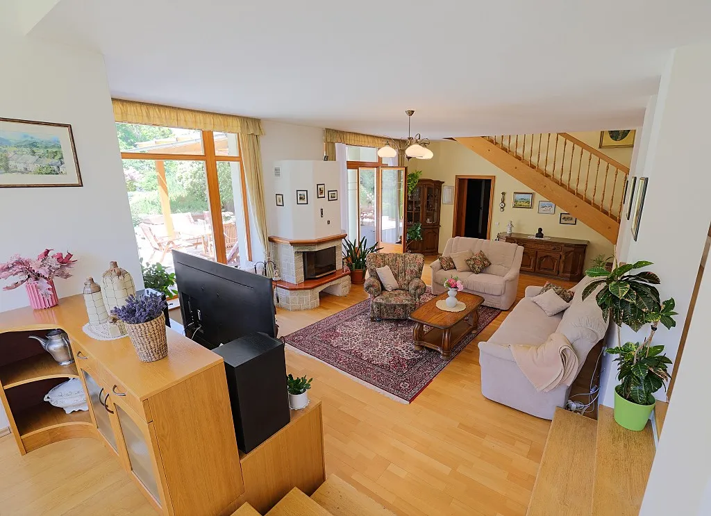 V přízemí se nachází hala, obývací pokoj, jídelna, kuchyně, spíž, ložnice, dvě šatny, koupelna, dvě WC, dvojgaráž, technická místnost, sklad, terasa a zemní sklep, v patře pak obývací pokoj, tři ložnice, šatna, koupelna, WC a dvě terasy, celkový užitný prostor představuje 365 m2.