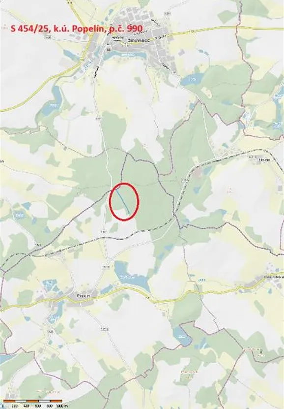 Jedná se o prodej lesního pozemku parc. č. 990 o výměře 4409 m2, úzkého protáhlého a nepravidelného tvaru, uvnitř velkého lesního útvaru tvořeném pozemky jiných vlastníků, zarostlého převážně listnatými stromy a keři.