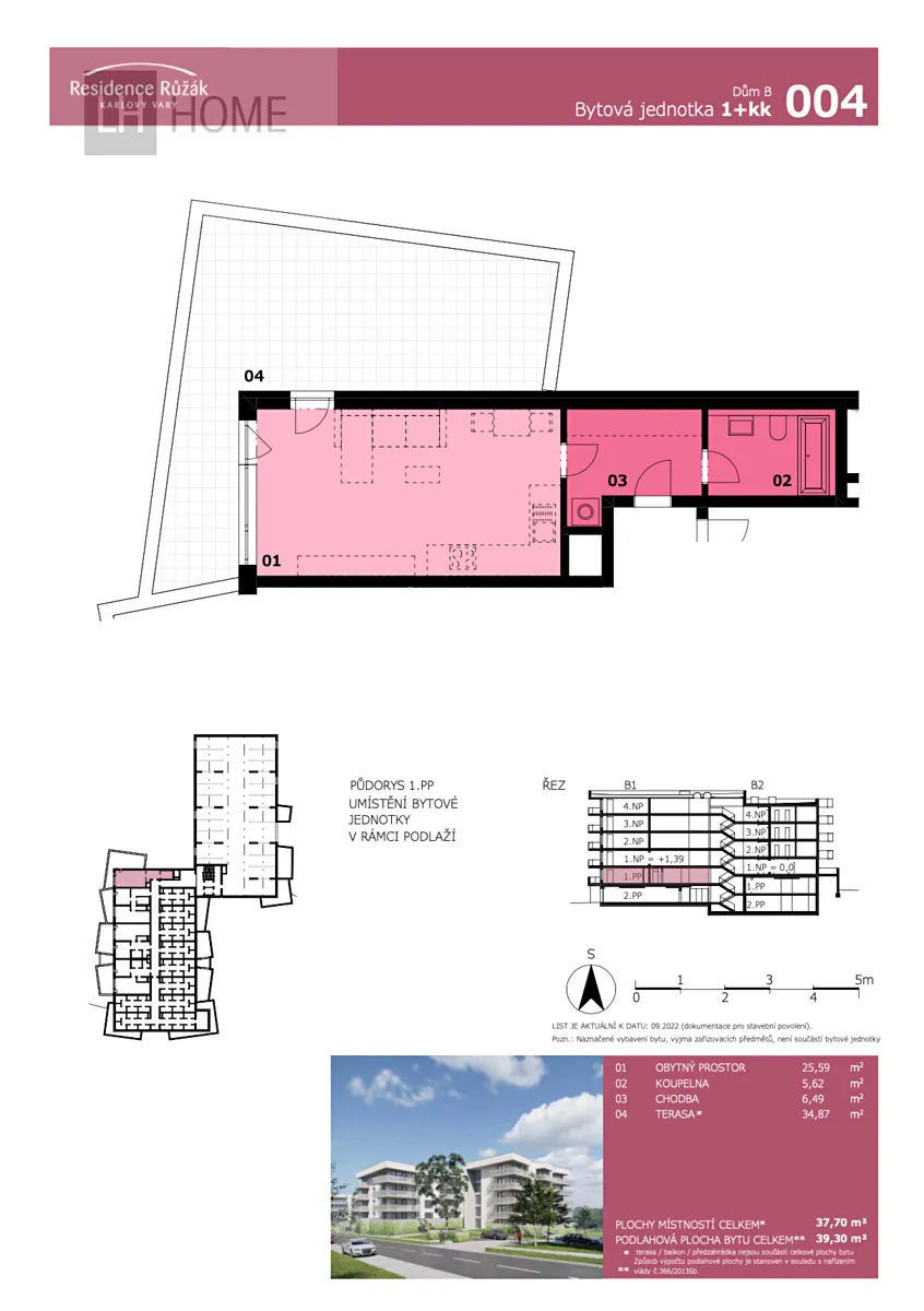 Nabízíme prodej bytu 1+kk - 39,4 m2 + terasa 34,87 m2 v 1. podzemním patře budovy B.