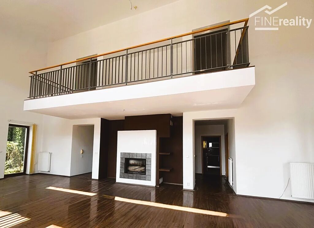 Hlavní obytný prostor je v 1. patře a skýtá velkolepý obývací pokoj s balkonem a krbem, který dodává interiéru příjemnou atmosféru. Velká dřevěná okna umožňují impozantní výhled a dostatek denního světla. Z chodby vedou patery dveře, z nichž jedny vedou do kuchyně, do které je také vchod z boku domu. Další vedou do pracovny, technické místnosti s pojistkovou skříní a úložným prostorem a šatny. Přes koupelnu s vanou, sprchovým koutem a toaletou projdeme do obrovské místnosti, která může sloužit jako zimní zahrada, nebo také posilovna. Najdeme tu sprchový kout a prosklenými dveřmi se dostaneme na menší nádvoří.